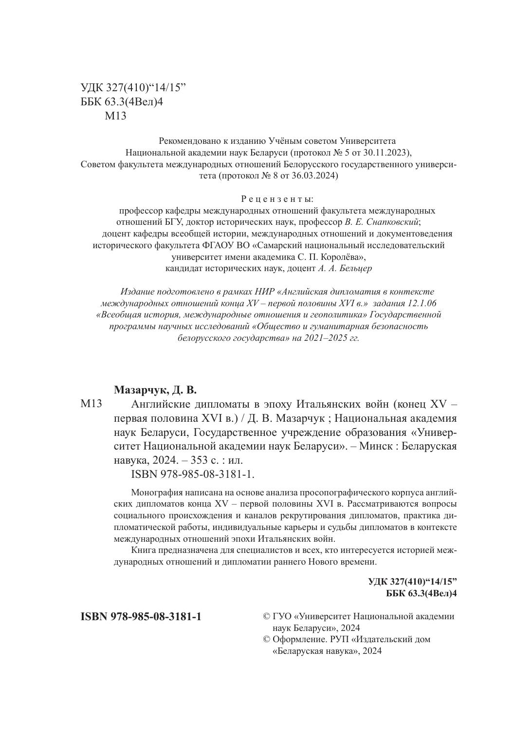 Монография написана на основе анализа просопографического корпуса английских дипломатов конца XV – первой половины XVI в. Рассматриваются вопросы социального происхождения и каналов рекрутирования дипломатов, практика дипломатической работы, индивидуальные карьеры и судьбы дипломатов в контексте международных отношений эпохи Итальянских войн. Книга предназначена для специалистов и всех, кто интересуется историей международных отношений и дипломатии раннего Нового времени.