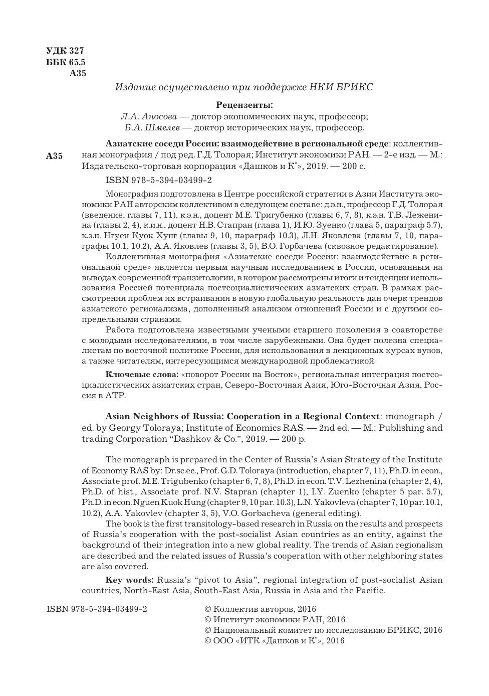 Монография подготовлена в Центре российской стратегии в Азии Института экономики РАН авторским коллективом в следующем составе: д.э.н., профессор Г.Д. Толорая (введение, главы 7, 11), к.э.н., доцент М.Е. Тригубенко (главы 6, 7, 8), к.э.н. Т.В. Леженина (главы 2, 4), к.и.н., доцент Н.В. Стапран (глава 1), И.Ю. Зуенко (глава 5, параграф 5.7), к.э.н. Нгуен Куок Хунг (главы 9, 10, параграф 10.3), Л.Н. Яковлева (главы 7, 10, параграфы 10.1, 10.2), А.А. Яковлев (главы 3, 5), В.О. Горбачева (сквозное редактирование). Коллективная монография «Азиатские соседи России: взаимодействие в региональной среде» является первым научным исследованием в России, основанным на выводах современной транзитологии, в котором рассмотрены итоги и тенденции использования Россией потенциала постсоциалистических азиатских стран. В рамках рассмотрения проблем их встраивания в новую глобальную реальность дан очерк трендов азиатского регионализма, дополненный анализом отношений России и с другими сопредельными странами. Работа подготовлена известными учеными старшего поколения в соавторстве с молодыми исследователями, в том числе зарубежными. Она будет полезна специалистам по восточной политике России, для использования в лекционных курсах вузов, а также читателям, интересующимся международной проблематикой.