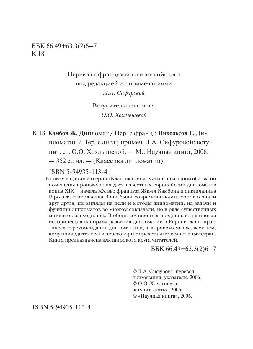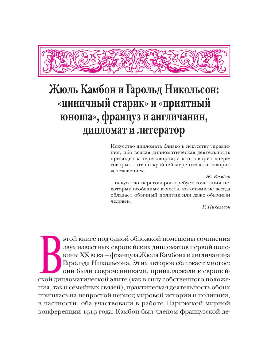 В новом издании из серии «Классика дипломатии» под одной обложкой помещены произведения двух известных европейских дипломатов конца XIX — начала XX вв.: француза Жюля Камбона и англичанина Гарольда Никольсона. Они были современниками, хорошо знали друг друга, их взгляды на цели и методы дипломатии, на задачи и функции дипломатов во многом совпадали, но в ряде существенных моментов расходились. В обоих сочинениях представлена широкая историческая панорама развития дипломатии в Европе, даны практические рекомендации дипломатам и, в широком смысле, всем тем, кому приходится вести переговоры с представителями разных стран. Книга предназначена для широкого круга читателей