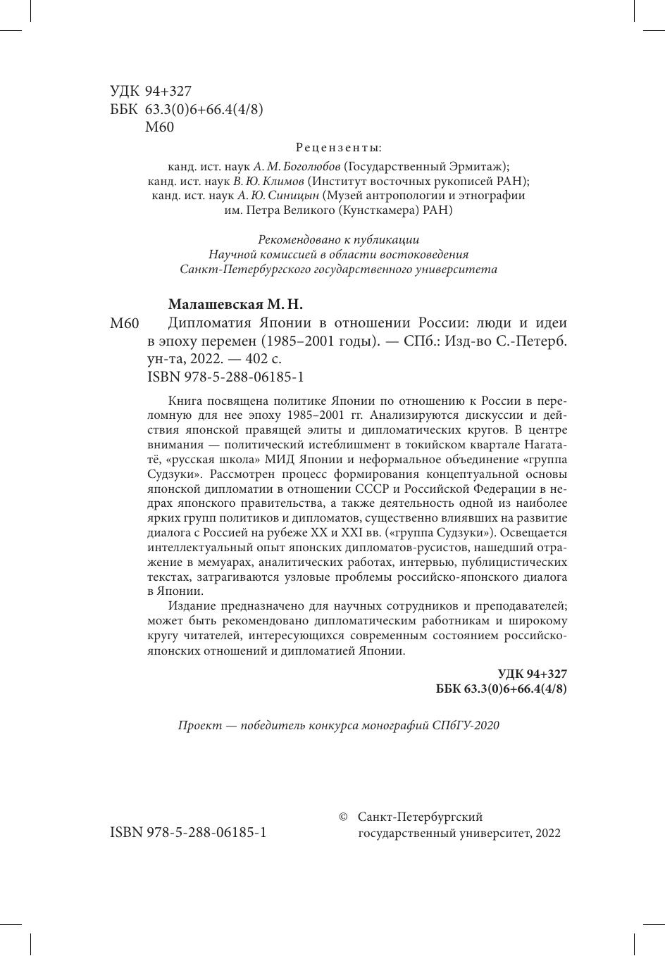 Книга посвящена политике Японии по отношению к России в переломную для нее эпоху 1985-2001 гг. Анализируются дискусии и действия японской правящей элиты и дипломатических кругов. В центре внимания - политический истеблишмент в токийском квартале Нагататё, "русская школа" МИД Японии и неформальное объединение "группа Судзуки". Рассмотерн вопрос формирования концептуальной основы японской дипломатии в отношении СССР и Российской Федерации в недрах японского правительства, а также деятельность одной из наиболее ярких групп политиков и дипломатов, существенно влиявших на развитие диалога с Россией на рубеже ХХ и ХХI вв. ("группа Судзуки"). Освещается интеллектуальный опыт японских дипломатов-русистов, нашедший отражение в мемуарах, аналитических работах, интервью, публицистических текстах, затрагиваются узловые проблемы российско-японского диалога в Японии.