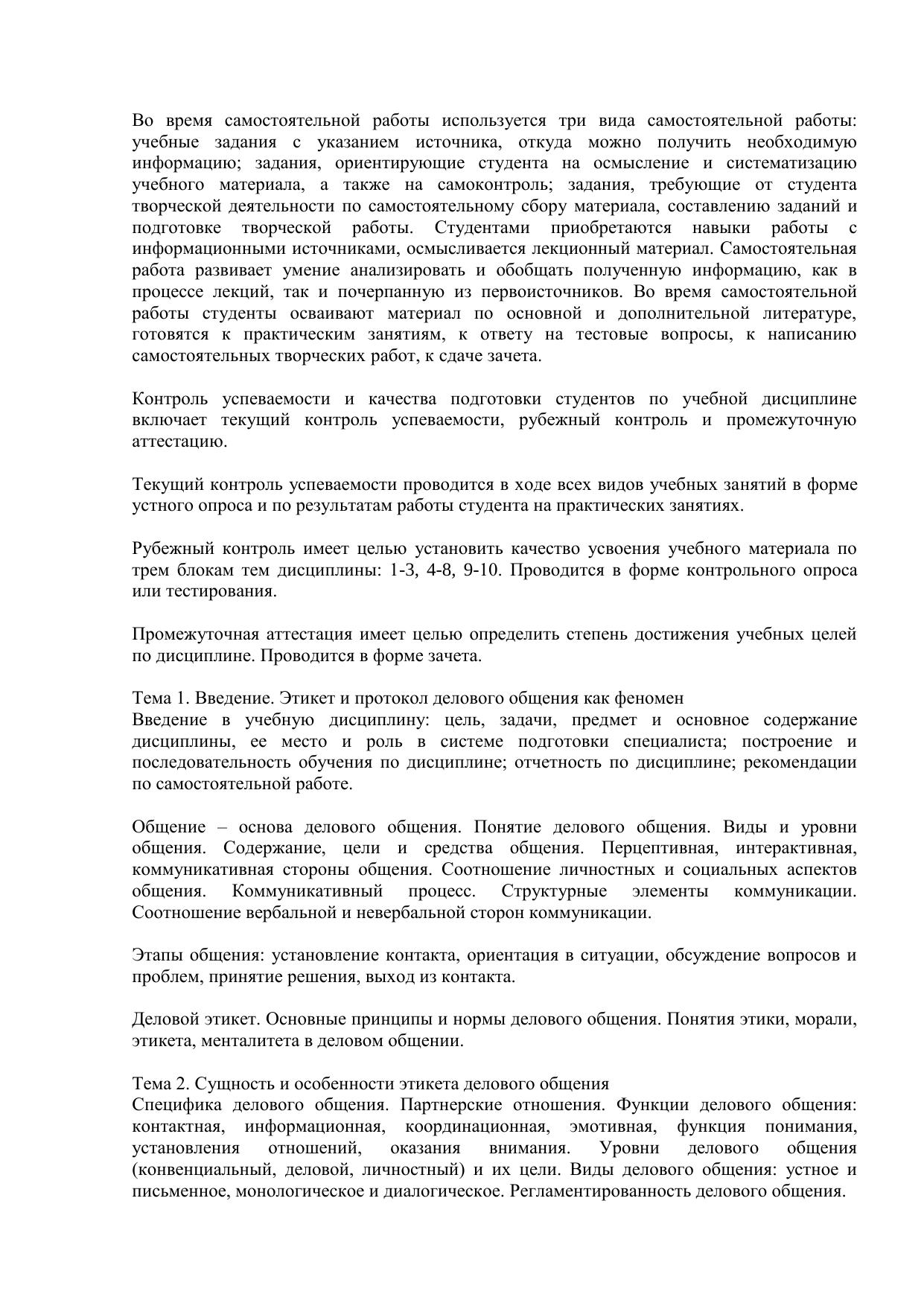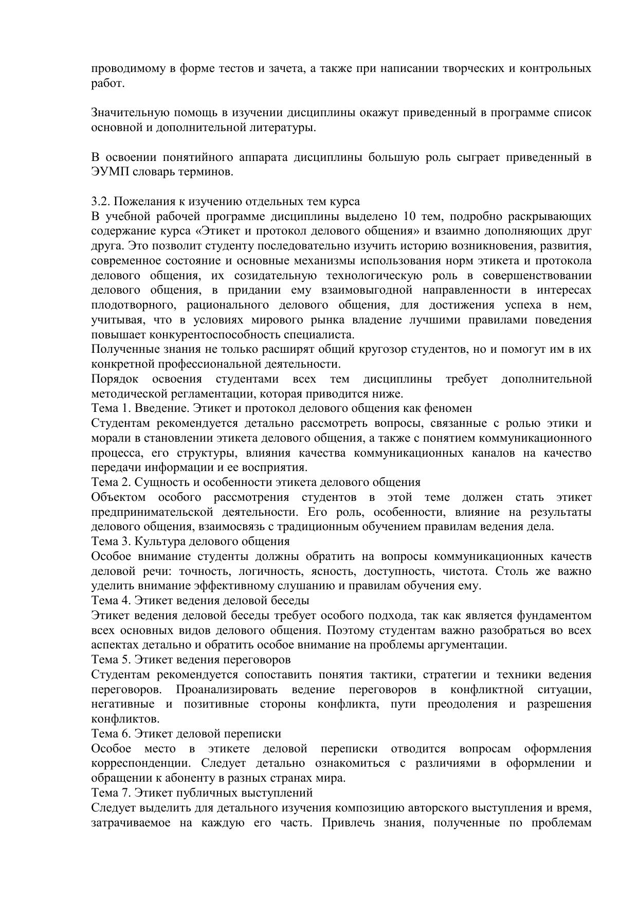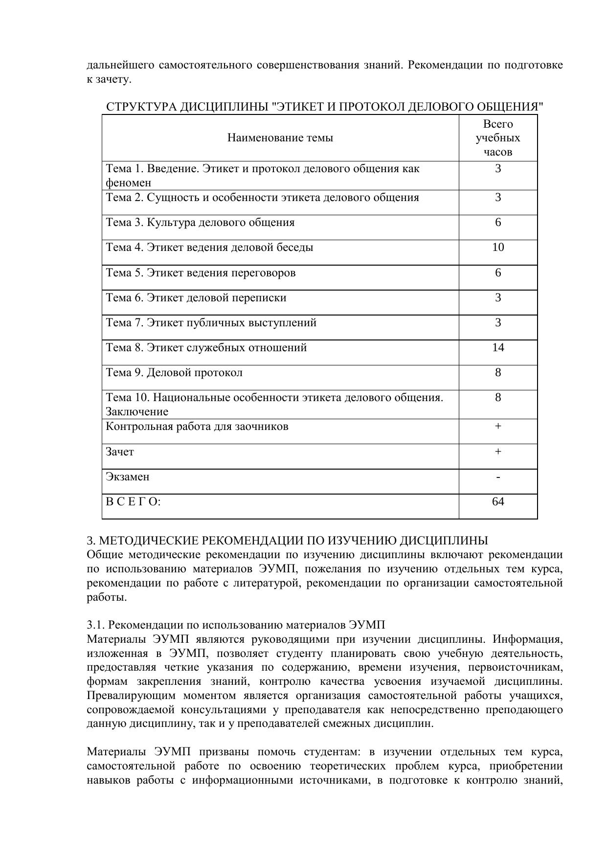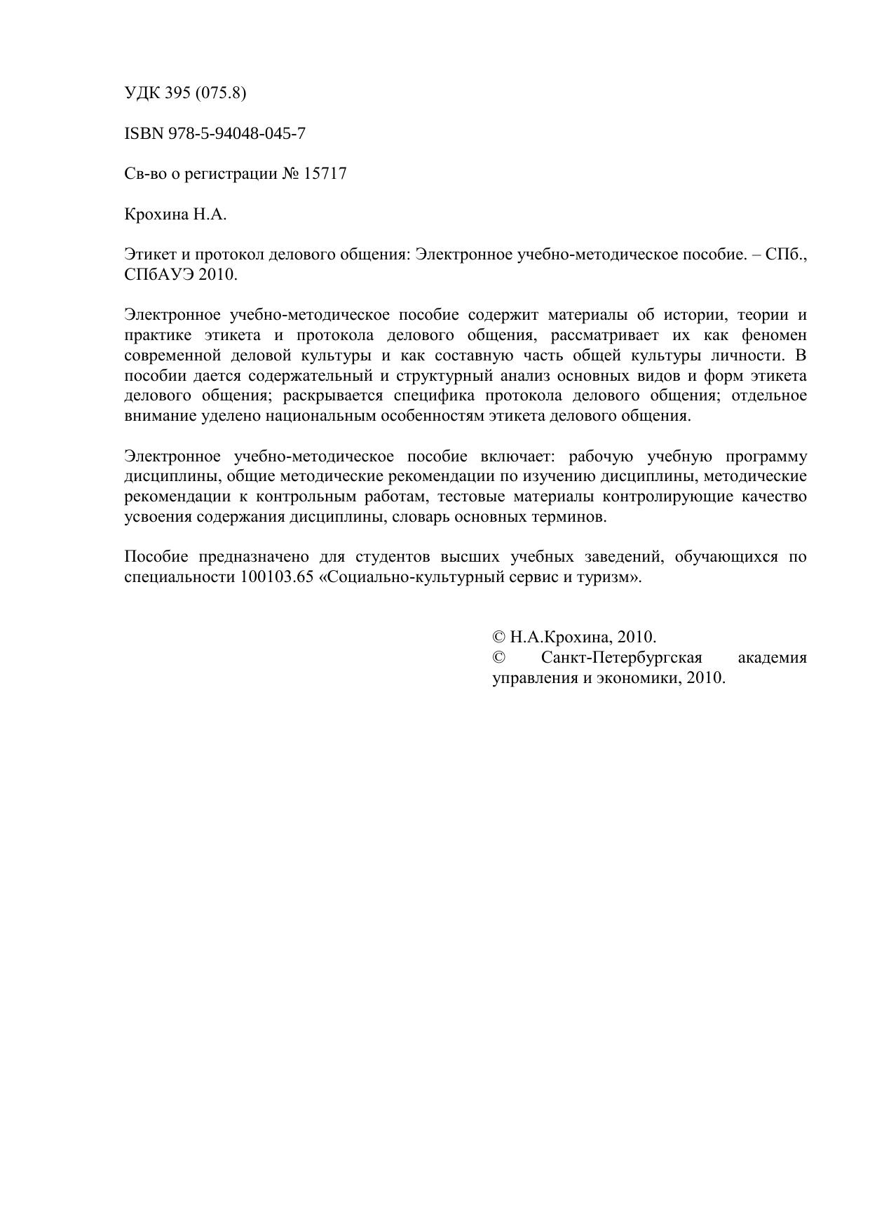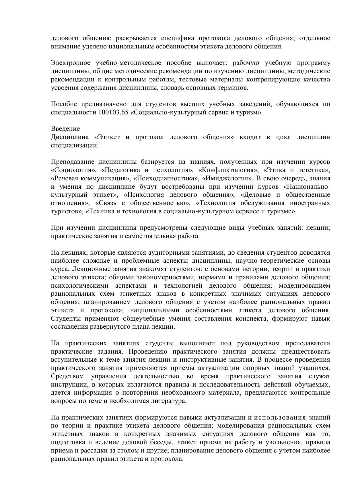 Электронное учебно-методическое пособие содержит материалы об истории, теории и практике этикета и протокола делового общения, рассматривает их как феномен современной деловой культуры и как составную часть общей культуры личности. В пособии дается содержательный и структурный анализ основных видов и форм этикета делового общения раскрывается специфика протокола делового общения отдельное внимание уделено национальным особенностям этикета делового общения. Электронное учебно-методическое пособие включает: рабочую учебную программу дисциплины, общие методические рекомендации по изучению дисциплины, методические рекомендации к контрольным работам, тестовые материалы, контролирующие качество усвоения содержания дисциплины, словарь основных терминов. Пособие предназначено для студентов высших учебных заведений, обучающихся по специальности 100103.65 «Социально-культурный сервис и туризм».
