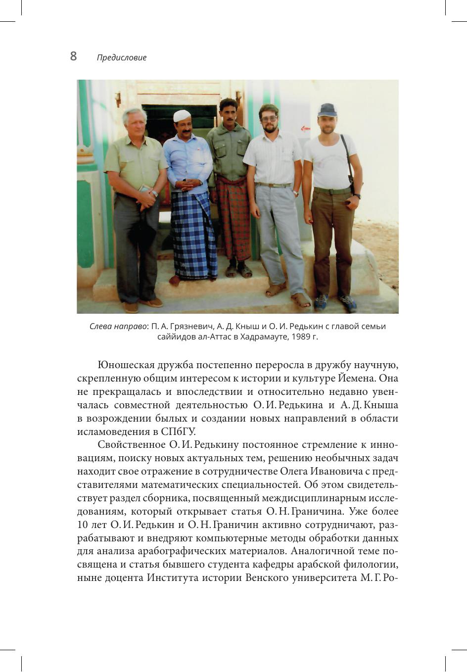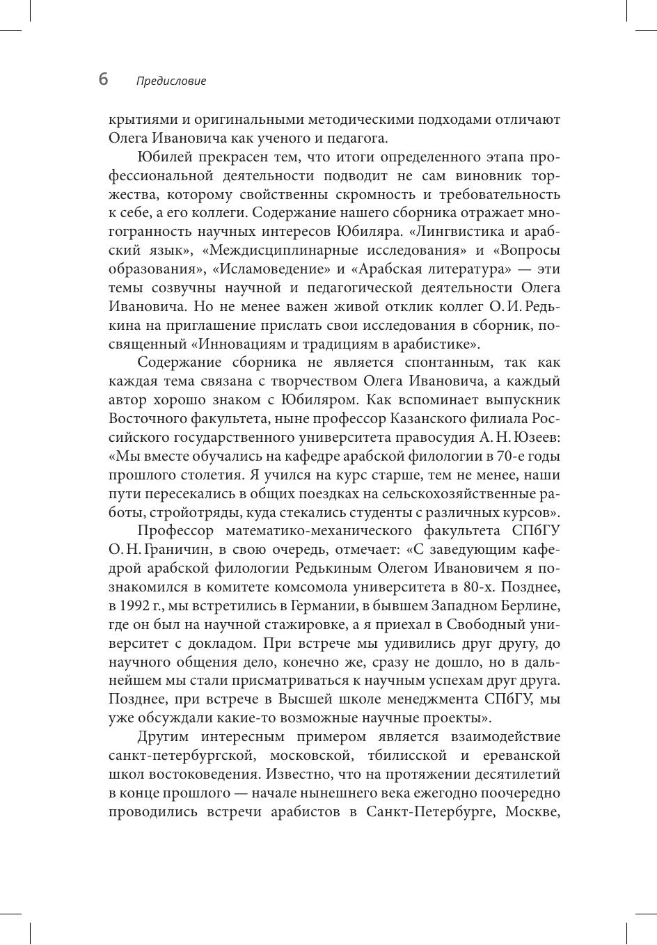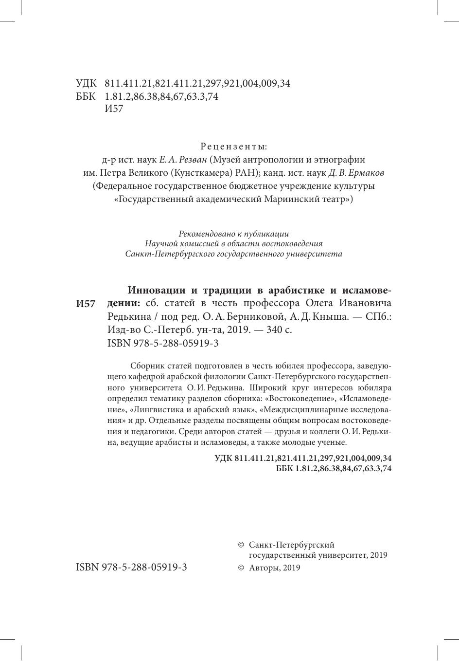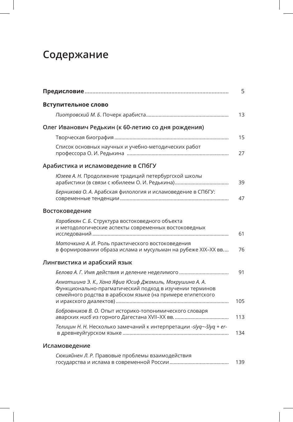 Сборник статей подготовлен в честь юбилея профессора, заведующего кафедрой арабской филологии Санкт-Петербургского государственного университета О. И. Редькина. Широкий круг интересов юбиляра определил тематику разделов сборника: «Востоковедение», «Исламоведение», «Лингвистика и арабский язык», «Междисциплинарные исследования» и др. Отдельные разделы посвящены общим вопросам востоковедения и педагогики. Среди авторов статей — друзья и коллеги О. И. Редькина, ведущие арабисты и исламоведы, а также молодые ученые.