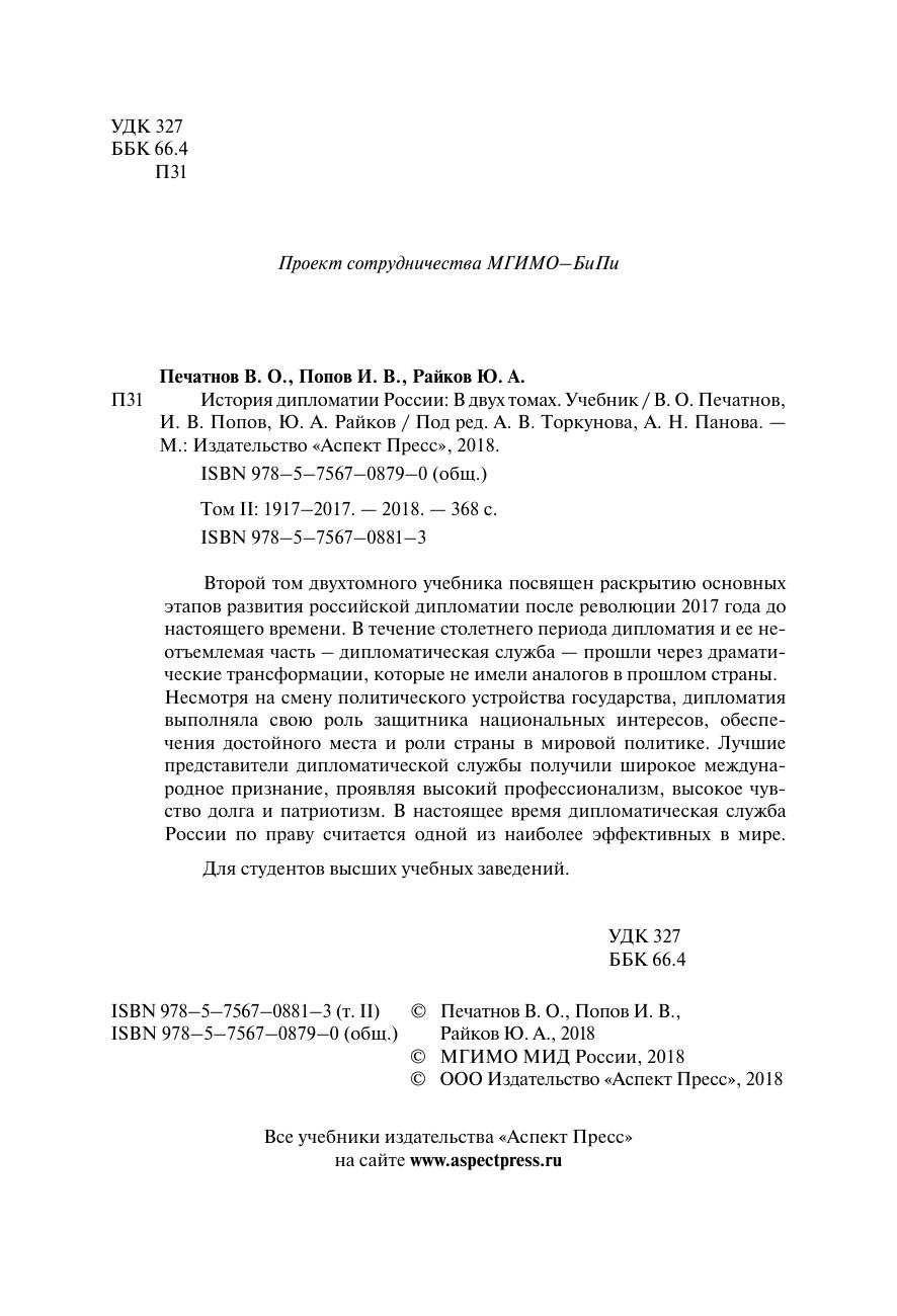 Второй том двухтомного учебника посвящен раскрытию основных этапов развития российской дипломатии после революции 2017 года до настоящего времени. В течение столетнего периода дипломатия и ее неотъемлемая часть – дипломатическая служба — прошли через драматические трансформации, которые не имели аналогов в прошлом страны. Несмотря на смену политического устройства государства, дипломатия выполняла свою роль защитника национальных интересов, обеспечения достойного места и роли страны в мировой политике. Лучшие представители дипломатической службы получили широкое международное признание, проявляя высокий профессионализм, высокое чувство долга и патриотизм. В настоящее время дипломатическая служба России по праву считается одной из наиболее эффективных в мире. Для студентов высших учебных заведений.