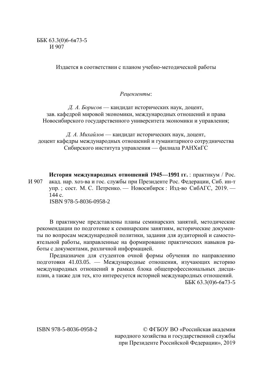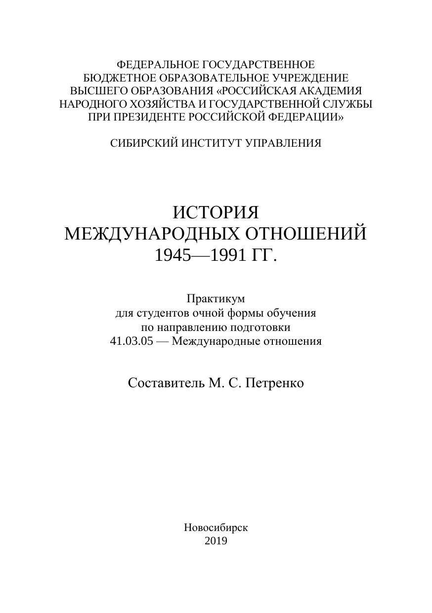 В практикуме представлены планы семинарских занятий, методические рекомендации по подготовке к семинарским занятиям, исторические докумен-ты по вопросам международной политики, задания для аудиторной и самосто-ятельной работы, направленные на формирование практических навыков ра-боты с документами, различной информацией. Предназначен для студентов очной формы обучения по направлению подготовки 41.03.05. — Международные отношения, изучающих историю международных отношений в рамках блока общепрофессиональных дисци-плин, а также для тех, кто интересуется историей международных отношений.