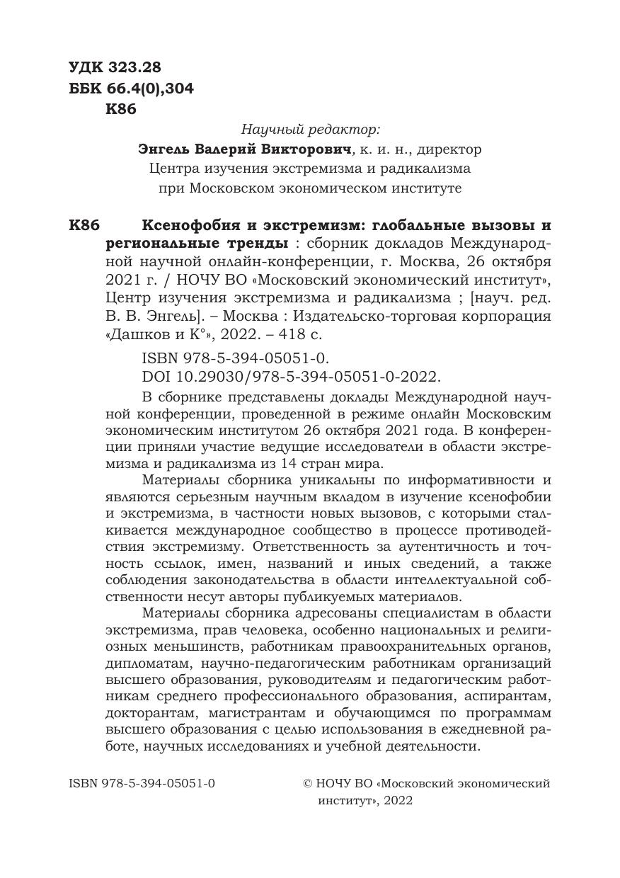 Материалы сборника уникальны по информативности и являются серьезным научным вкладом в изучение ксенофобии и экстремизма, в частности новых вызовов, с которыми сталкивается международное сообщество в процессе противодействия экстремизму. Ответственность за аутентичность и точность ссылок, имен, названий и иных сведений, а также соблюдения законодательства в области интеллектуальной собственности несут авторы публикуемых материалов.