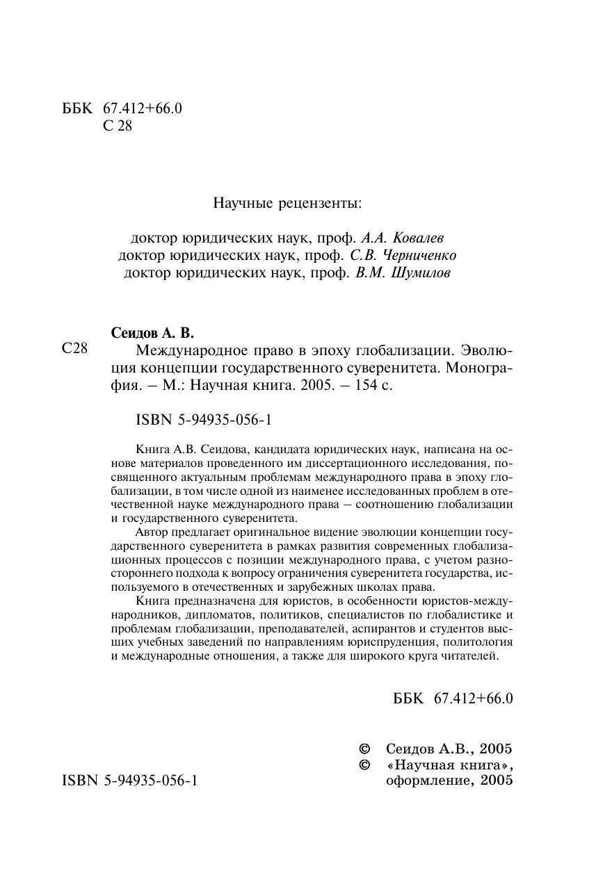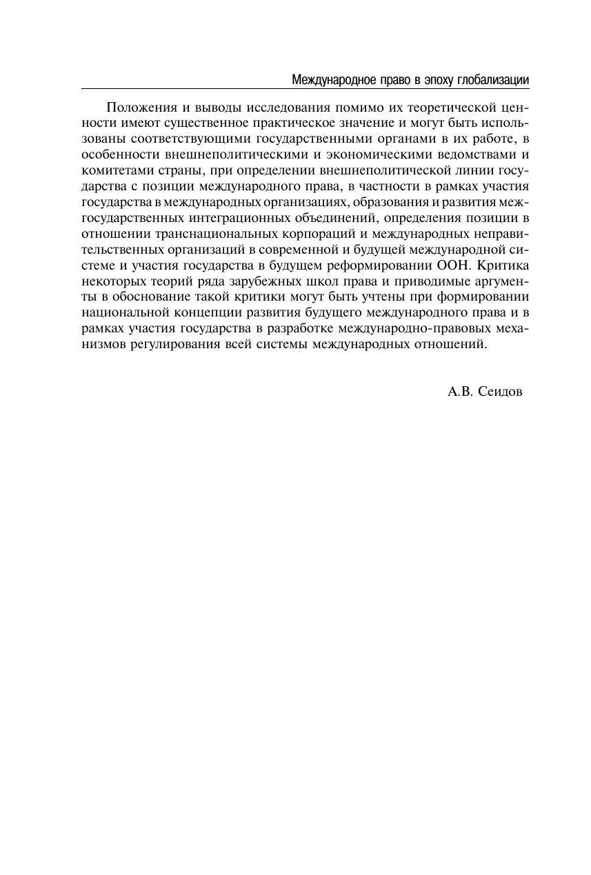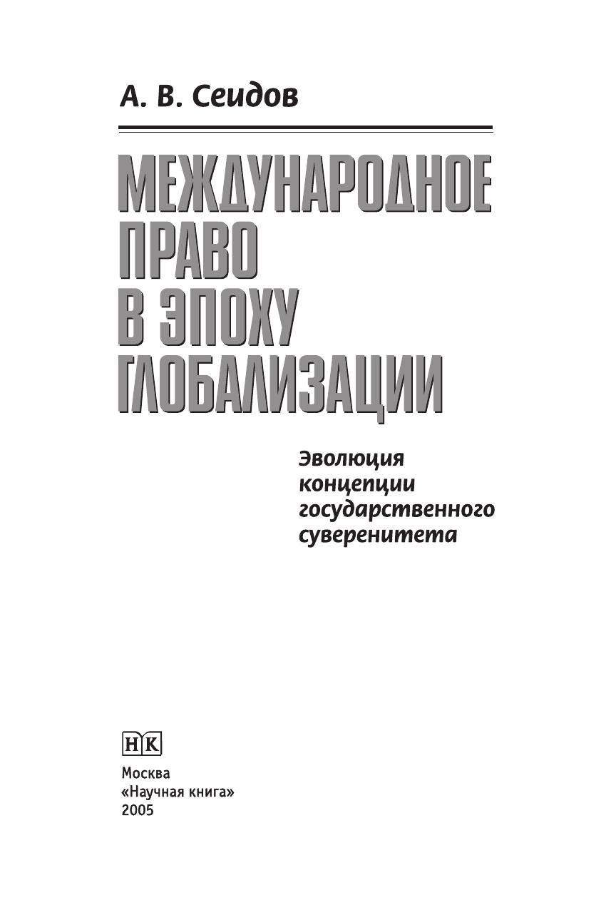 Книга А.В. Сеидова, кандидата юридических наук, написана на основе материалов проведенного им диссертационного исследования, посвященного актуальным проблемам международного права в эпоху глобализации, в том числе одной из наименее исследованных проблем в отечественной науке международного права – соотношению глобализации и государственного суверенитета. Автор предлагает оригинальное видение эволюции концепции государственного суверенитета в рамках развития современных глобализационных процессов с позиции международного права, с учетом разностороннего подхода к вопросу ограничения суверенитета государства, используемого в отечественных и зарубежных школах права. Книга предназначена для юристов, в особенности юристов-международников, дипломатов, политиков, специалистов по глобалистике и проблемам глобализации, преподавателей, аспирантов и студентов высших учебных заведений по направлениям юриспруденция, политология и международные отношения, а также для широкого круга читателей.