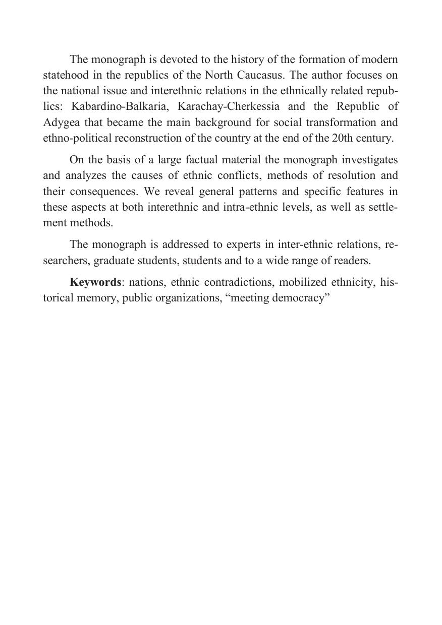 Монография посвящена истории становления современной государственности в республиках Северного Кавказа. В центре внимания автора – национальный вопрос и межнациональные отношения в этнически родственных