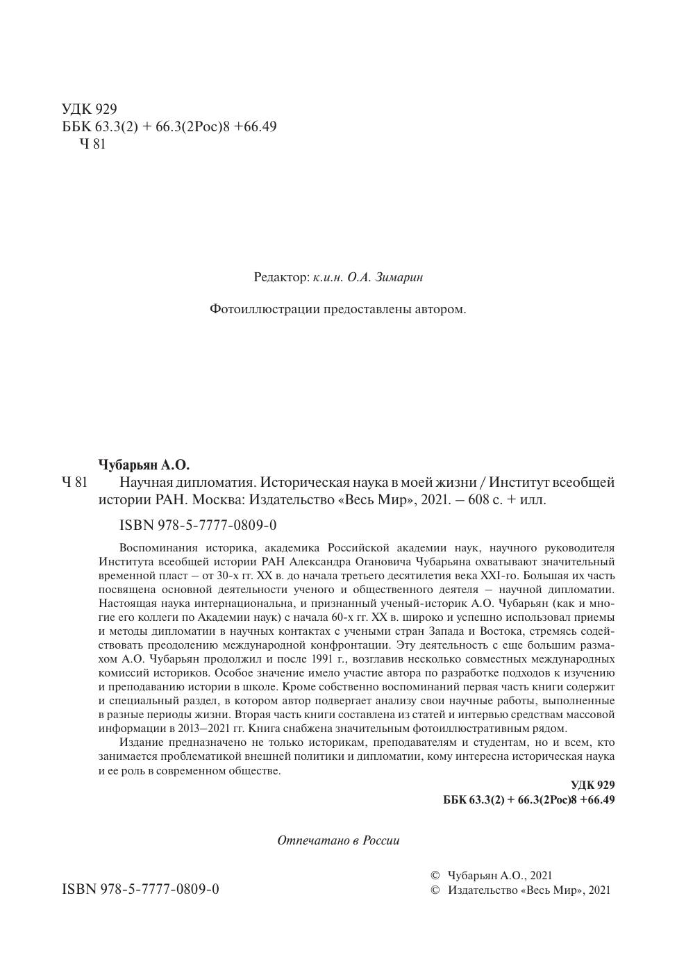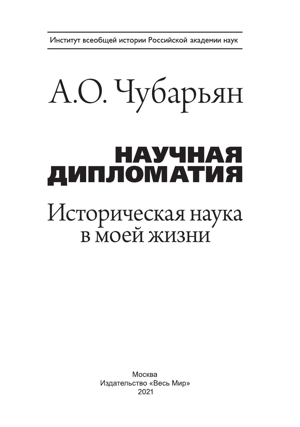 Воспоминания историка, академика Российской академии наук, научного руководителя Института всеобщей истории РАН Александра Огановича Чубарьяна охватывают значительный временной пласт – от 30-х гг. XX в. до начала третьего десятилетия века XXI-го. Большая их часть посвящена основной деятельности ученого и общественного деятеля – научной дипломатии. Настоящая наука интернациональна, и признанный ученый-историк А.О. Чубарьян (как и многие его коллеги по Академии наук) с начала 60-х гг. XX в. широко и успешно использовал приемы и методы дипломатии в научных контактах с учеными стран Запада и Востока, стремясь содействовать пре одолению международной конфронтации. Эту деятельность с еще большим размахом А.О. Чубарь ян продолжил и после 1991 г., возглавив несколько совместных международных комиссий историков. Особое значение имело участие автора по разработке подходов к изучению и преподаванию истории в школе. Кроме собственно воспоминаний первая часть книги содержит и специальный раздел, в котором автор подвергает анализу свои научные работы, выполненные в разные периоды жизни. Вторая часть книги составлена из статей и интервью средствам массовой информации в 2013–2021 гг. Книга снабжена значительным фотоиллюстративным рядом. Издание предназначено не только историкам, преподавателям и студентам, но и всем, кто занимается проблематикой внешней политики и дипломатии, кому интересна историческая наука и ее роль в современном обществе.