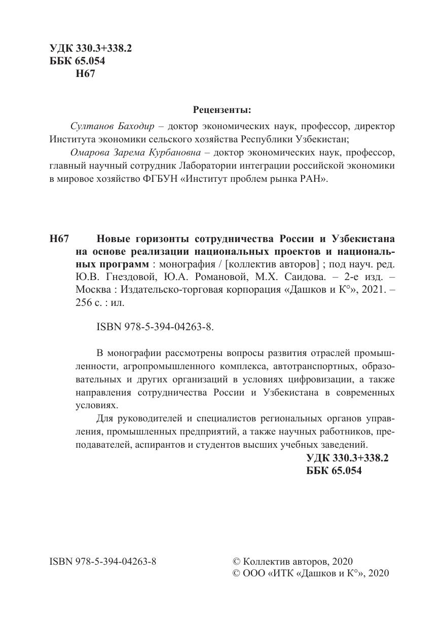 В монографии рассмотрены вопросы развития отраслей промышленности, агропромышленного комплекса, автотранспортных, образовательных и других организаций в условиях цифровизации, а также направления сотрудничества России и Узбекистана в современных условиях.