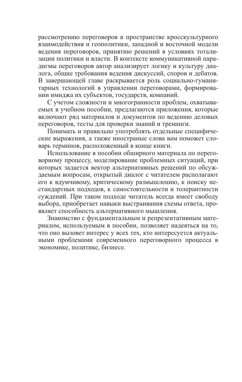 Рассматриваются типология, принципы, альтернативные модели ведения переговоров. Раскрывается взаимосвязь переговоров и политического риска в контексте глобализации. Дается содержание основных этапов переговорного процесса, а также материал о стратегиях и тактиках их проведения. Особое внимание уделяется западной и восточной моделям ведения переговоров, логике и культуре диалога. Приложения включают образцы документов по ведению деловых переговоров, задания и тренинги. В конце пособия имеется словарь терминов. Для студентов вузов, преподавателей, магистрантов, аспирантов, специалистов, всех, кто интересуется актуальными проблемами современного переговорного процесса в экономике, политике, бизнесе.