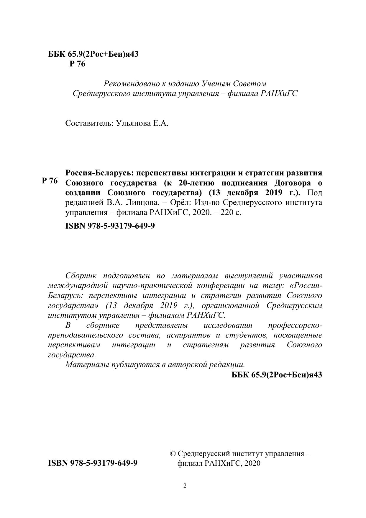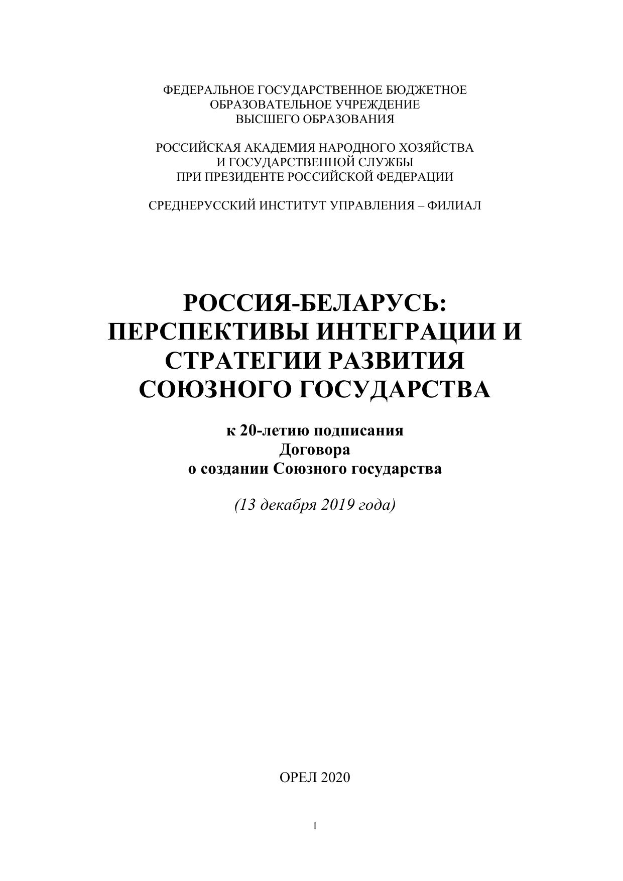 Сборник подготовлен по материалам выступлений участников международной научно-практической конференции на тему: «РоссияБеларусь: перспективы интеграции и стратегии развития Союзного государства» (13 декабря 2019 г.), организованной Среднерусским институтом управления – филиалом РАНХиГС. В сборнике представлены исследования профессорскопреподавательского состава, аспирантов и студентов, посвященные перспективам интеграции и стратегиям развития Союзного государства. Материалы публикуются в авторской редакции.