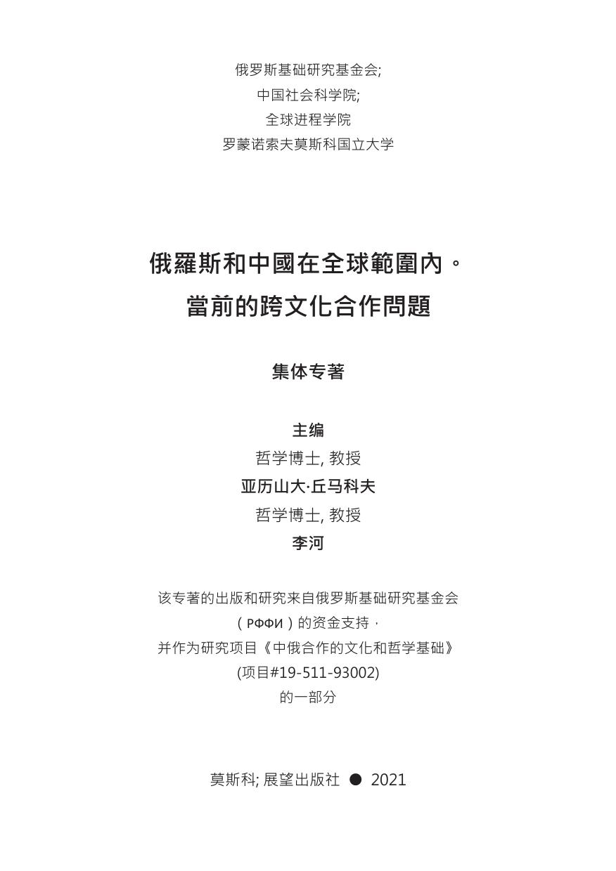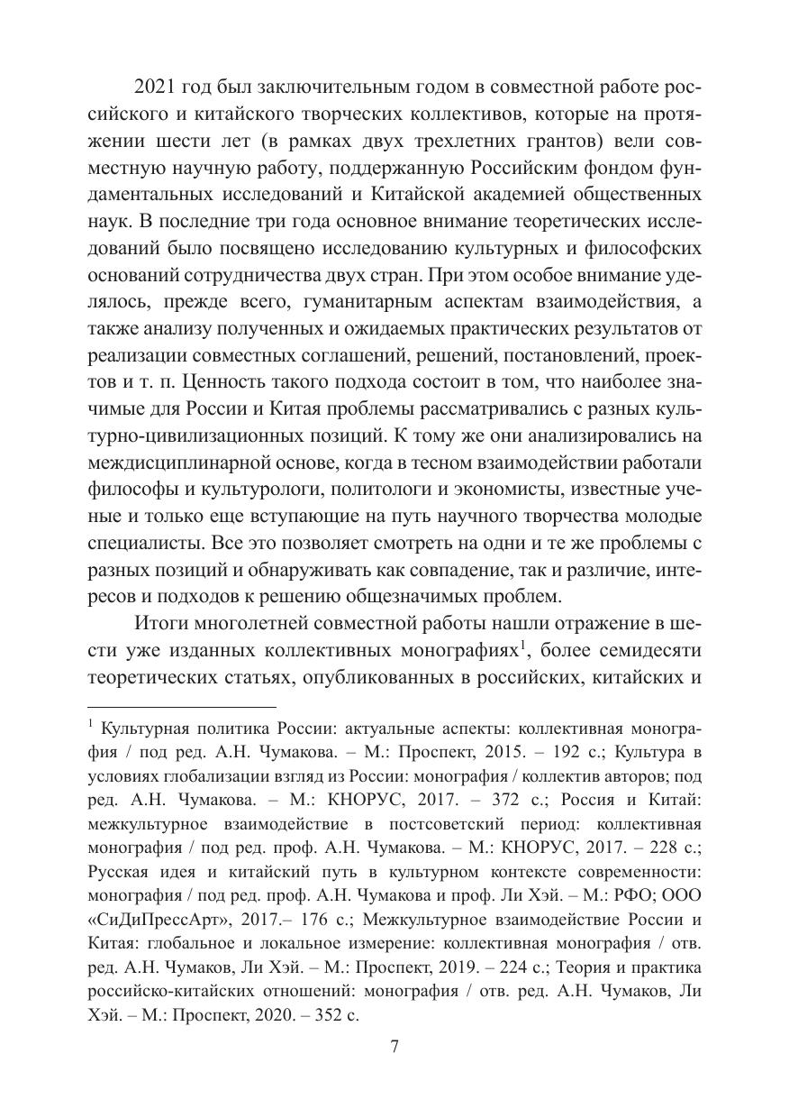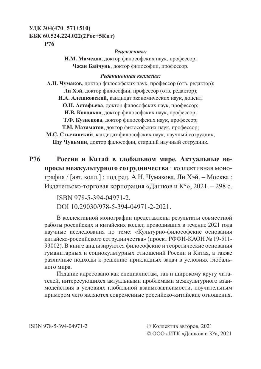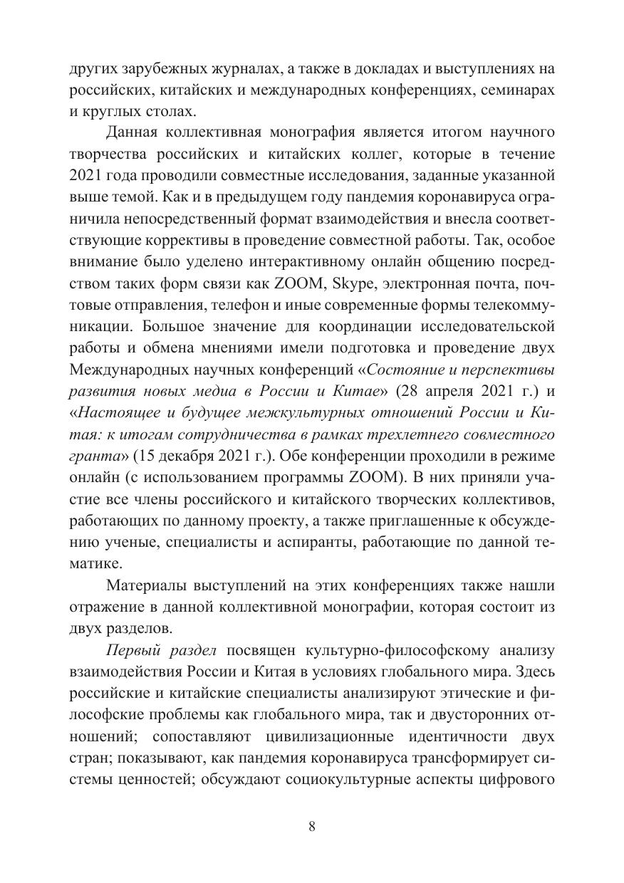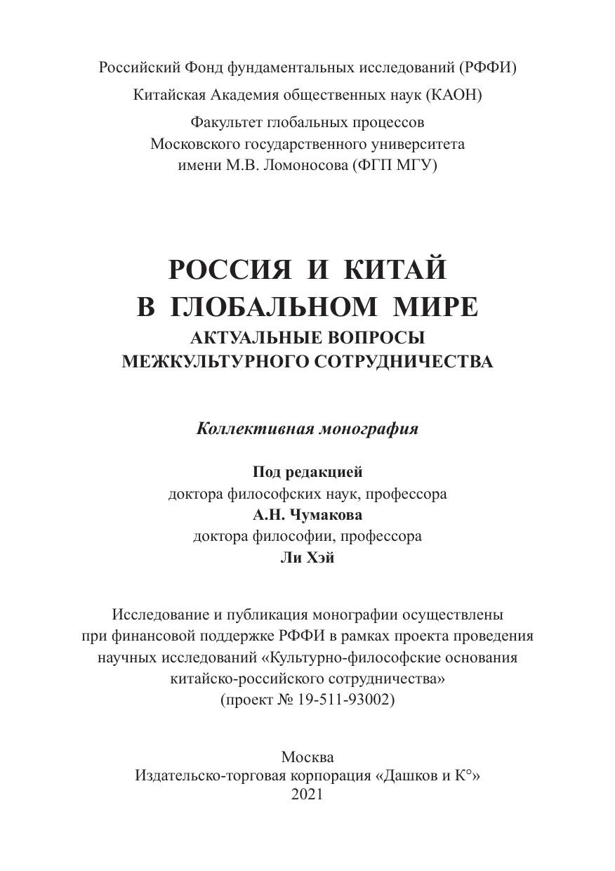 В коллективной монографии представлены результаты сов-местной работы российских и китайских коллег, проводивших в течение 2021 года научные исследования по теме: «Культурно-философские основания китайско-российского сотрудничества» (проект РФФИ-КАОН № 19-511-93002). В книге анализируются философские и теоретические основания гуманитарных и социокультурных отношений России и Китая, а также различные подходы к решению прикладных задач в условиях глобального мира.