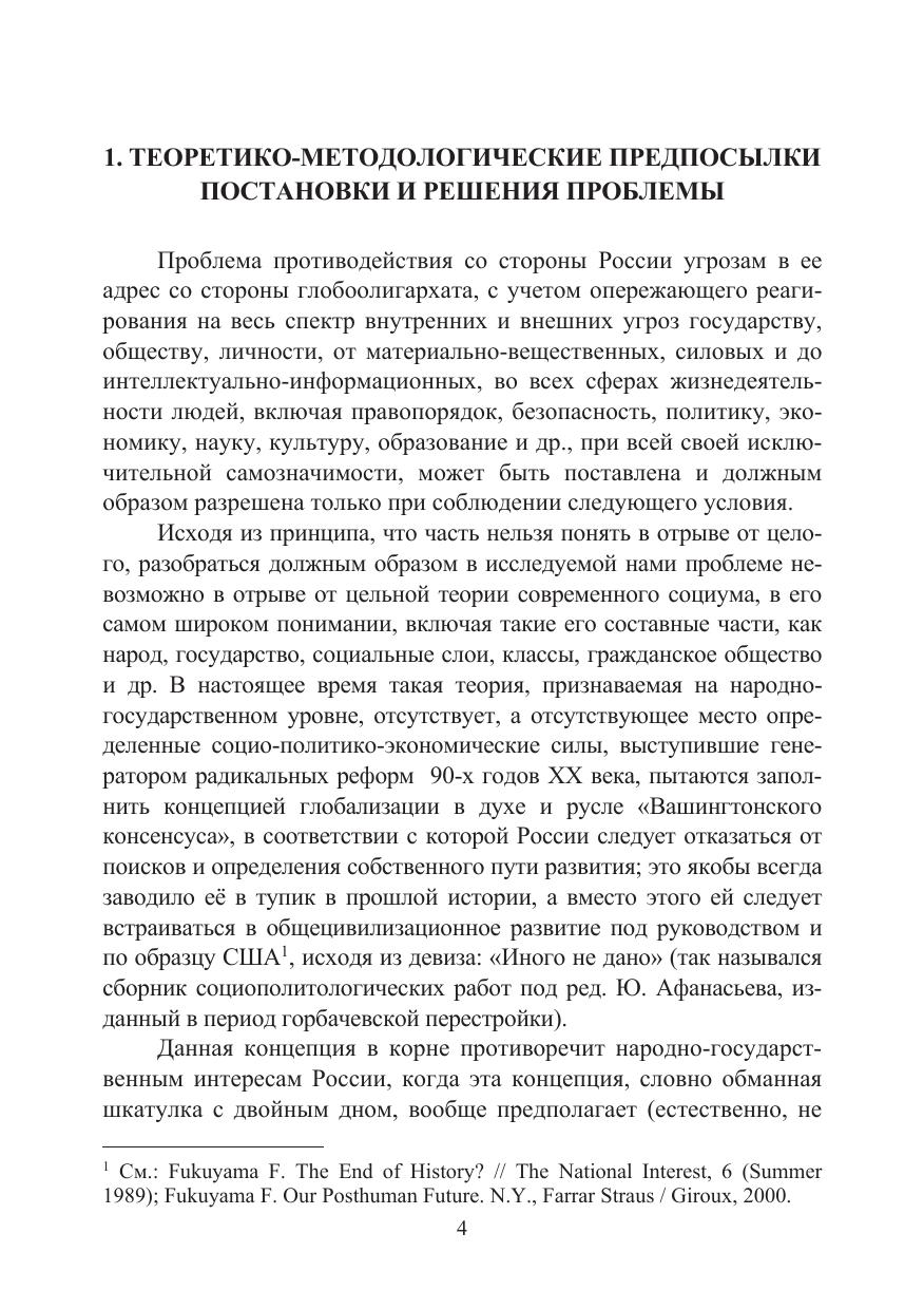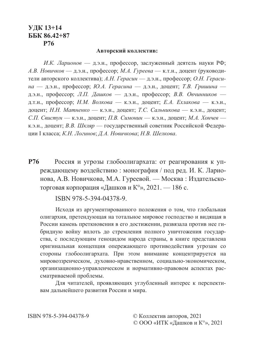 Исходя из аргументированного положения о том, что глобальная олигархия, претендующая на тотальное мировое господство и видящая в России камень преткновения в его достижении, развязала против нее гибридную войну вплоть до стремления полного уничтожения государства, с последующим геноцидом народа страны, в книге представлена оригинальная концепция опережающего противодействия угрозам со стороны глобоолигархата.