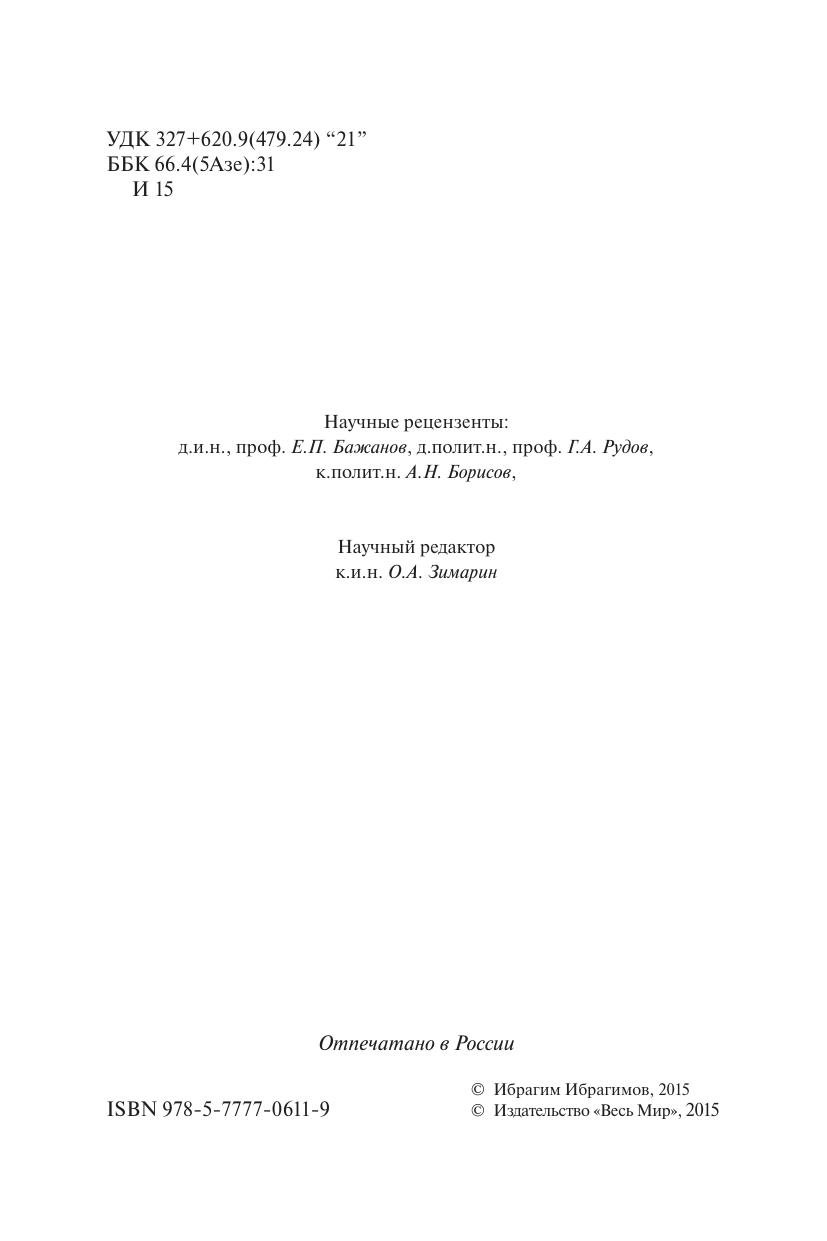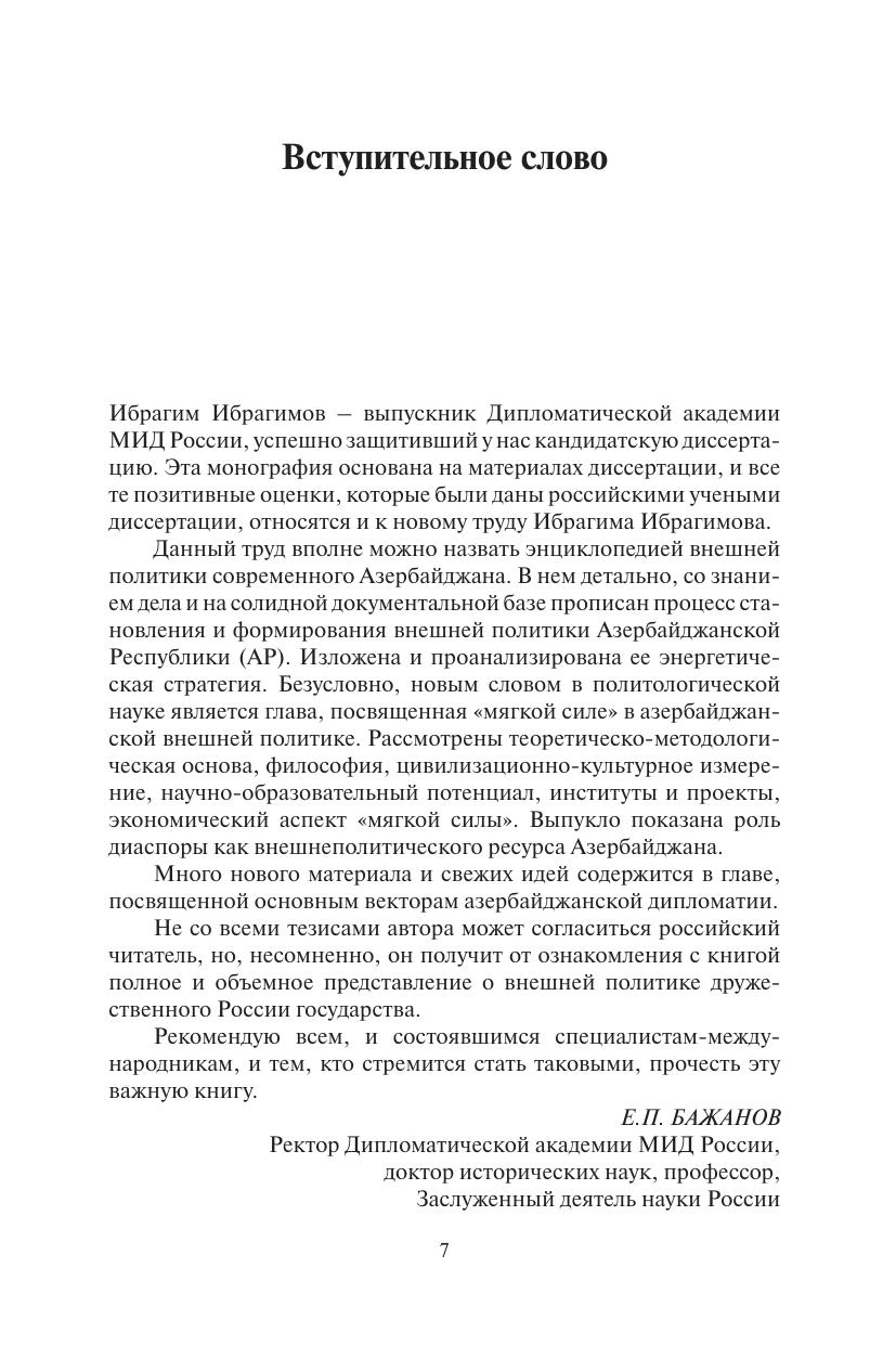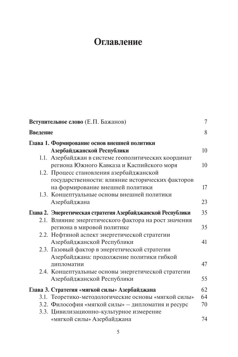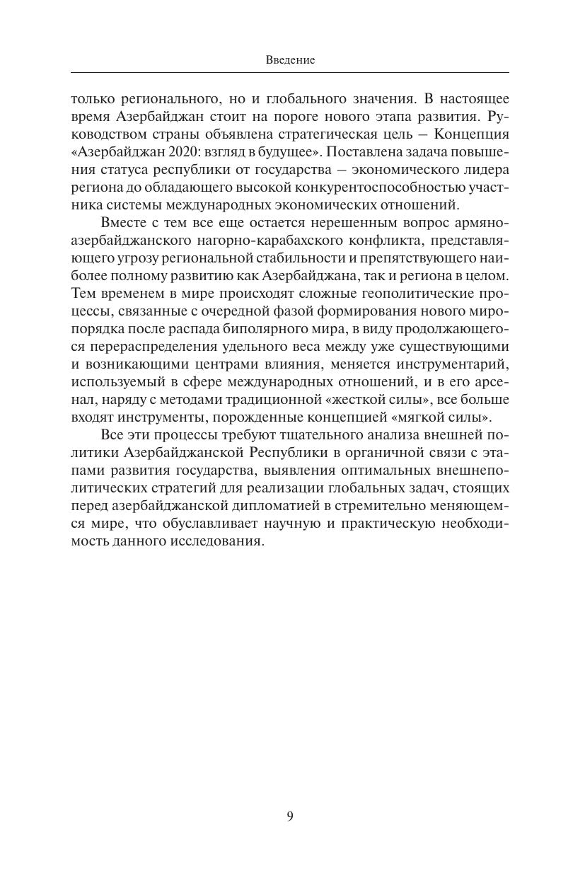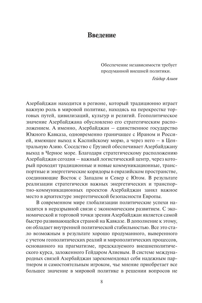 Монография посвящена становлению и развитию стратегии внешней политики Азербайджана после восстановления независимости республики. В книге подробно описаны геополитическое положение страны, имеющиеся в ее распоряжении ресурсы. Основное внимание уделено формированию и осуществлению сбалансированной многовекторной внешней политики, основания которой были заложены Президентом Гейдаром Алиевым. Особое внимание автор уделяет использованию Азербайджаном «мягкой силы», в которой он видит не только инструмент достижения внешнеполитических целей, но и определенную философию, поставленную Азербайджаном в центр поведения страны на международной арене. В книге детально рассмотрены взаимоотношения Азербайджана с основными глобальными и региональными акторами, в том числе межправительственными организациями и интеграционными объединениями. Книга рекомендуется специалистам и экспертам в области международных отношений, занимающихся проблемами региона Южного Кавказа и Каспийского моря, а также постсоветского пространства.