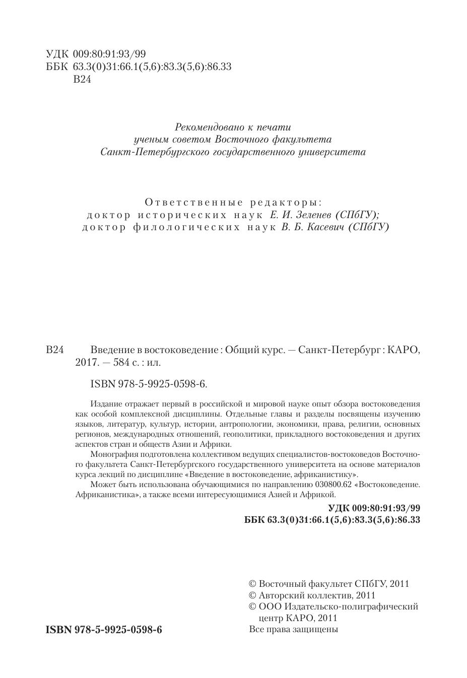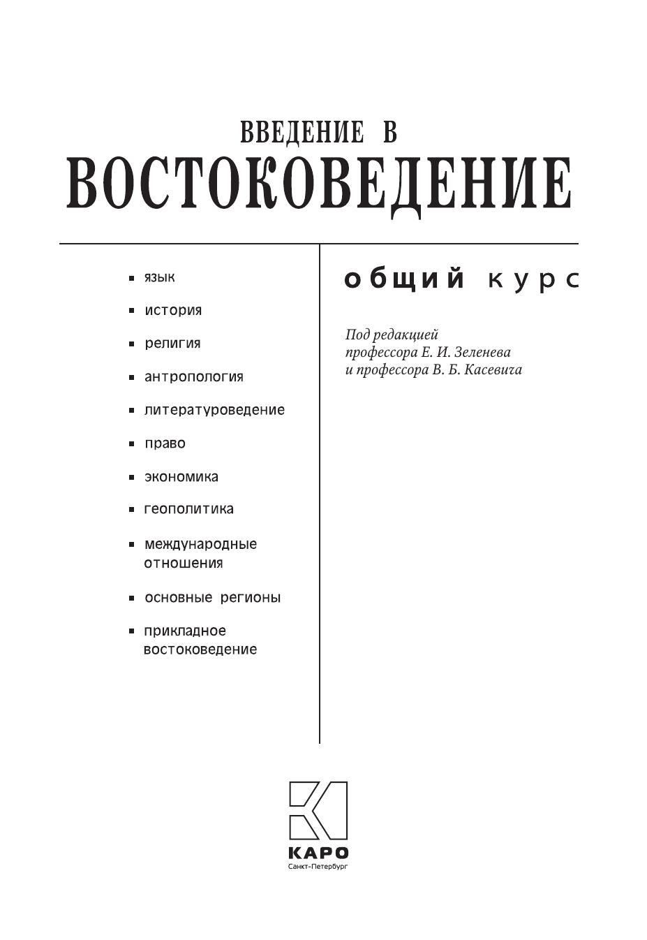 Издание отражает первый в российской и мировой науке опыт обзора востоковедения как особой комплексной дисциплины. Отдельные главы и разделы посвящены изучению языков, литератур, культур, истории, антропологии, экономики, права, религии, основных регионов, международных отношений, геополитики, прикладного востоковедения и других аспектов стран и обществ Азии и Африки. Монография подготовлена коллективом ведущих специалистов-востоковедов Восточного факультета Санкт-Петербургского государственного университета на основе материалов курса лекций по дисциплине «Введение в востоковедение, африканистику». Может быть использована обучающимися по направлению 030800.62 «Востоковедение. Африканистика», а также всеми интересующимися Азией и Африкой.