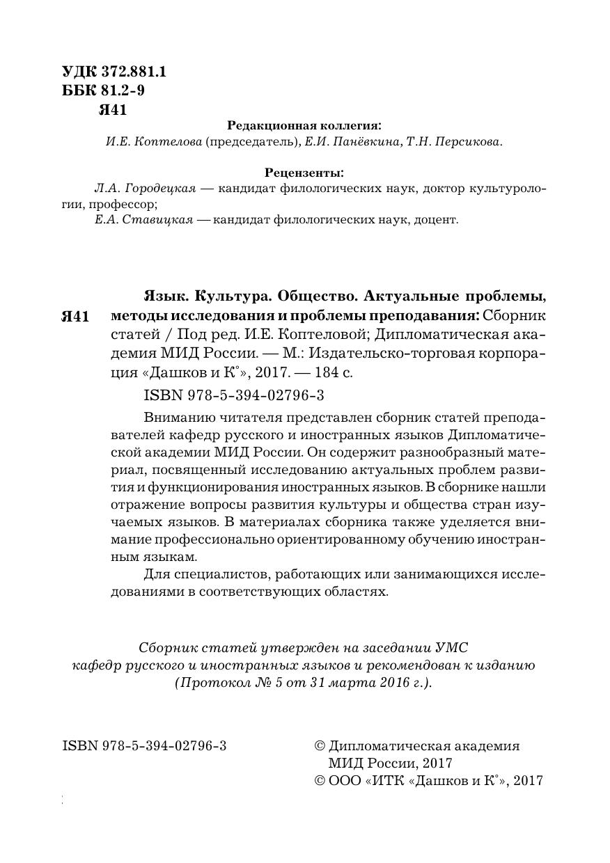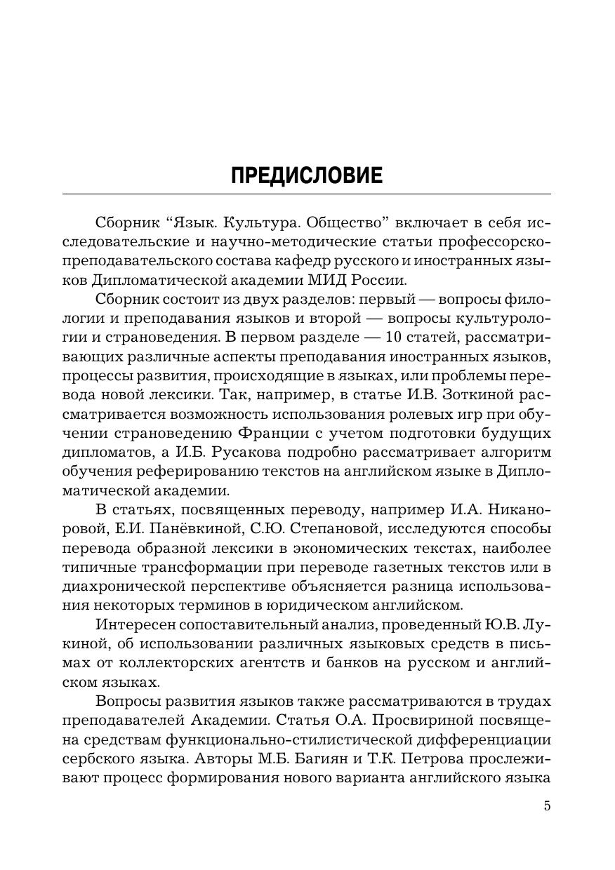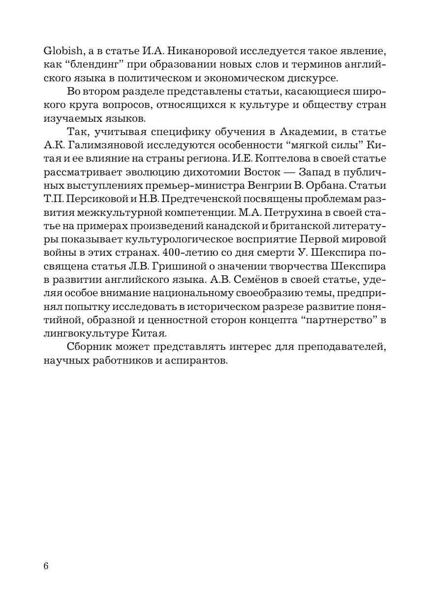 Вниманию читателя представлен сборник статей преподавателей кафедр русского и иностранных языков Дипломатической академии МИД России. Он содержит разнообразный материал, посвященный исследованию актуальных проблем развития и функционирования иностранных языков. В сборнике нашли отражение вопросы развития культуры и общества стран изучаемых языков. В материалах сборника также уделяется внимание профессионально ориентированному обучению иностранным языкам.