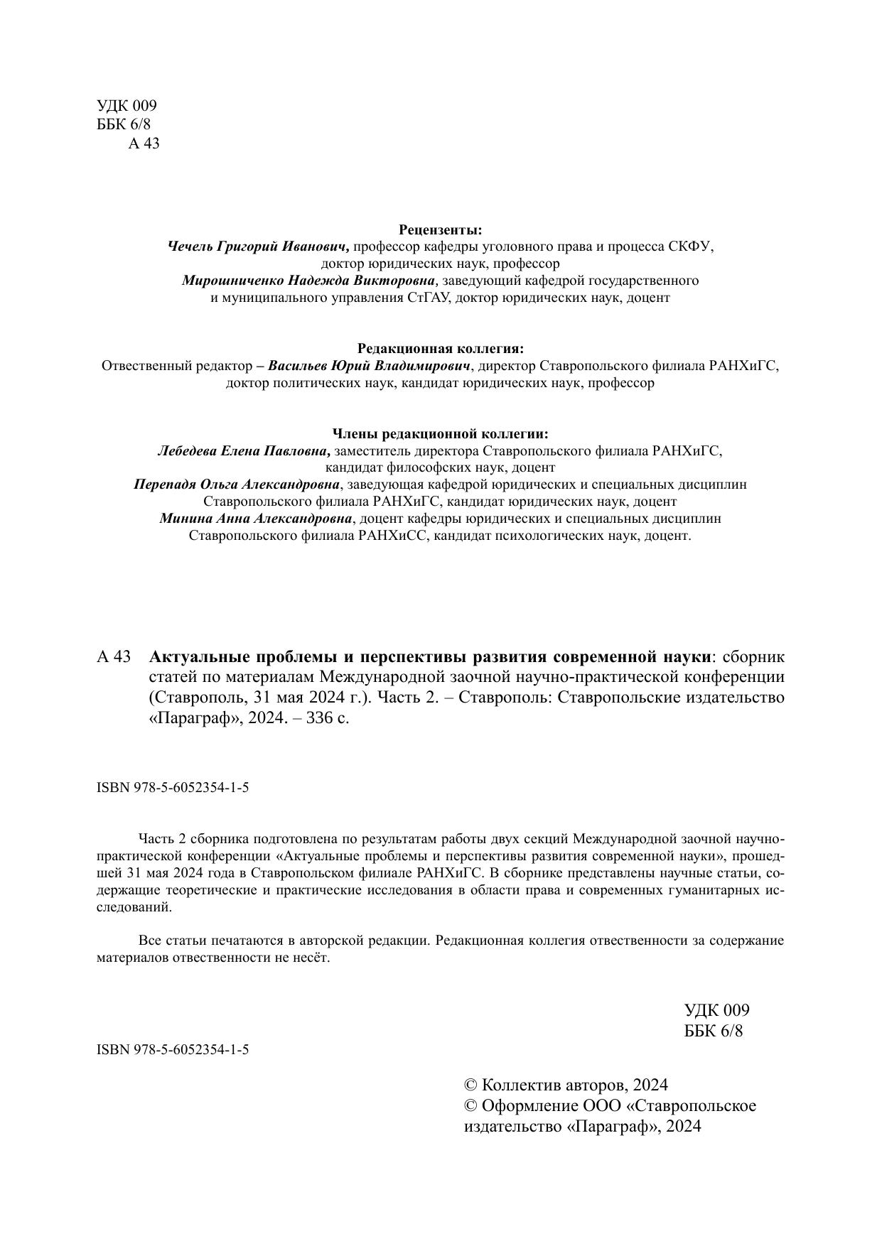 Часть 2 сборника подготовлена по результатам работы двух секций Международной заочной научно-практической конференции «Актуальные проблемы и перспективы развития современной науки», прошед-шей 31 мая 2024 года в Ставропольском филиале РАНХиГС. В сборнике представлены научные статьи, со-держащие теоретические и практические исследования в области права и современных гуманитарных ис-следований. Все статьи печатаются в авторской редакции. Редакционная коллегия отвественности за содержание материалов отвественности не несѐт.