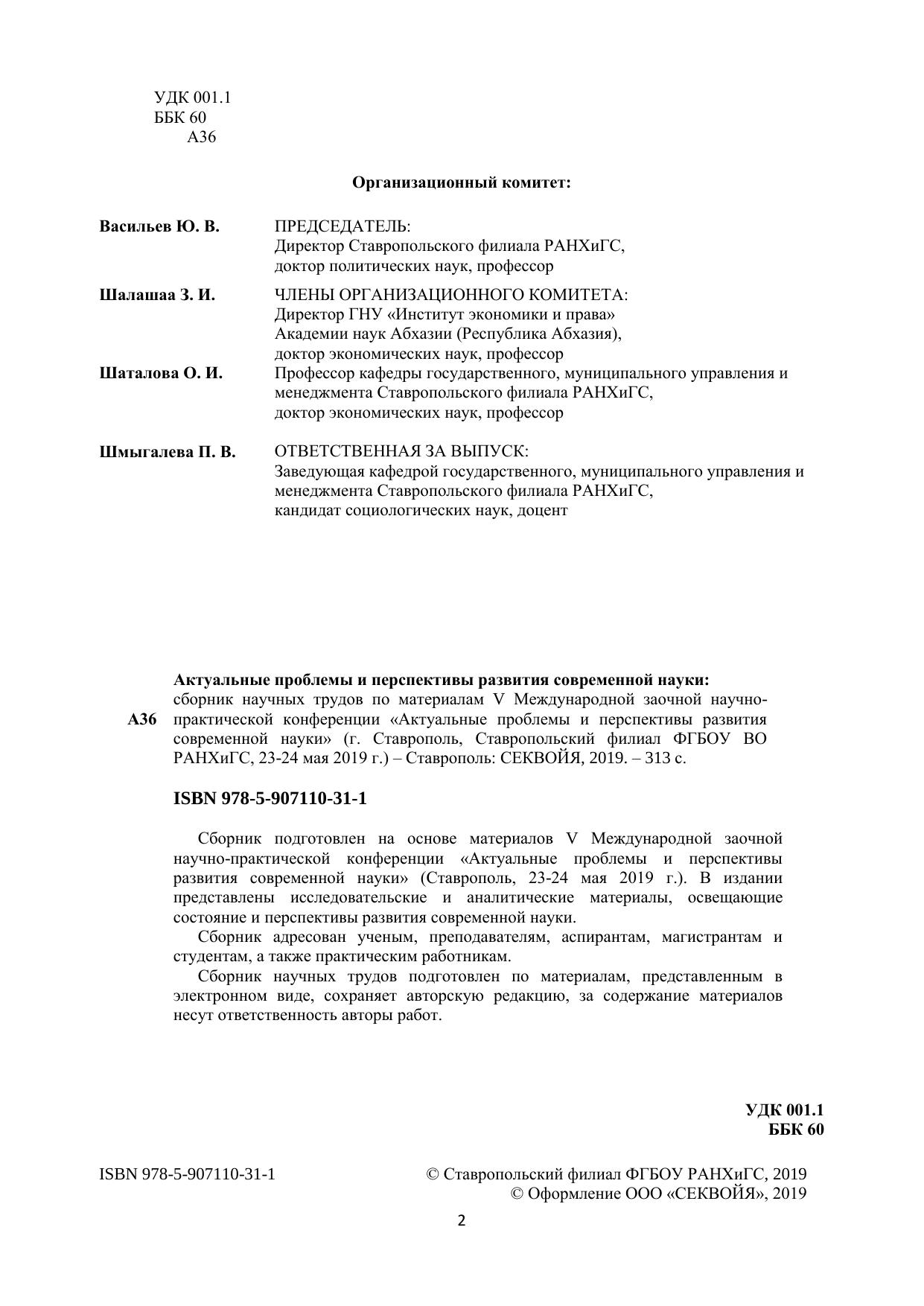Актуальные проблемы и перспективы развития современной науки: сборник научных трудов по материалам V Международной заочной научно-практической конференции «Актуальные проблемы и перспективы развития современной науки» (г. Ставрополь, Ставропольский филиал ФГБОУ ВО РАНХиГС, 23-24 мая 2019 г.)