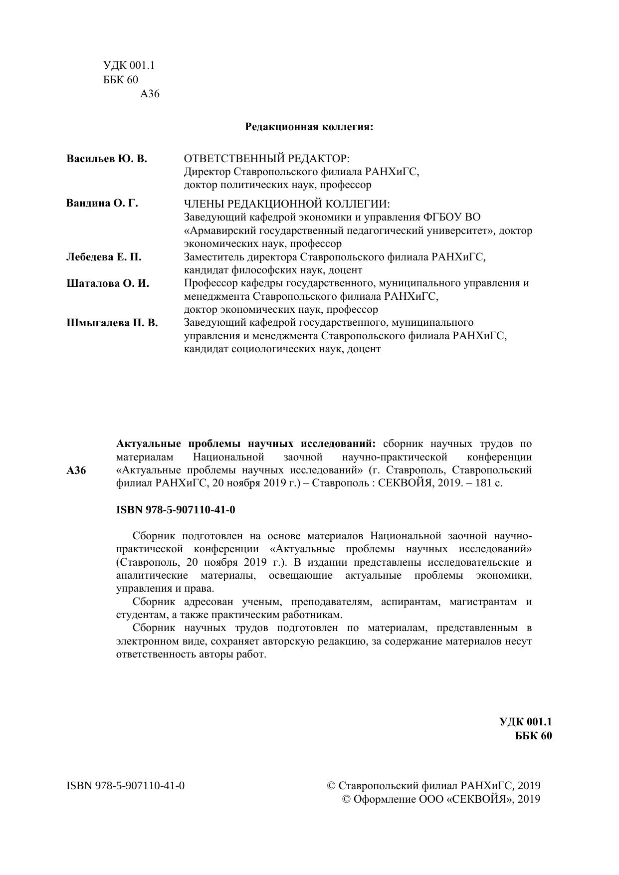 Актуальные проблемы научных исследований: сборник научных трудов по материалам Национальной заочной научно-практической конференции «Актуальные проблемы научных исследований» (г. Ставрополь, Ставропольский филиал РАНХиГС, 20 ноября 2019 г.)