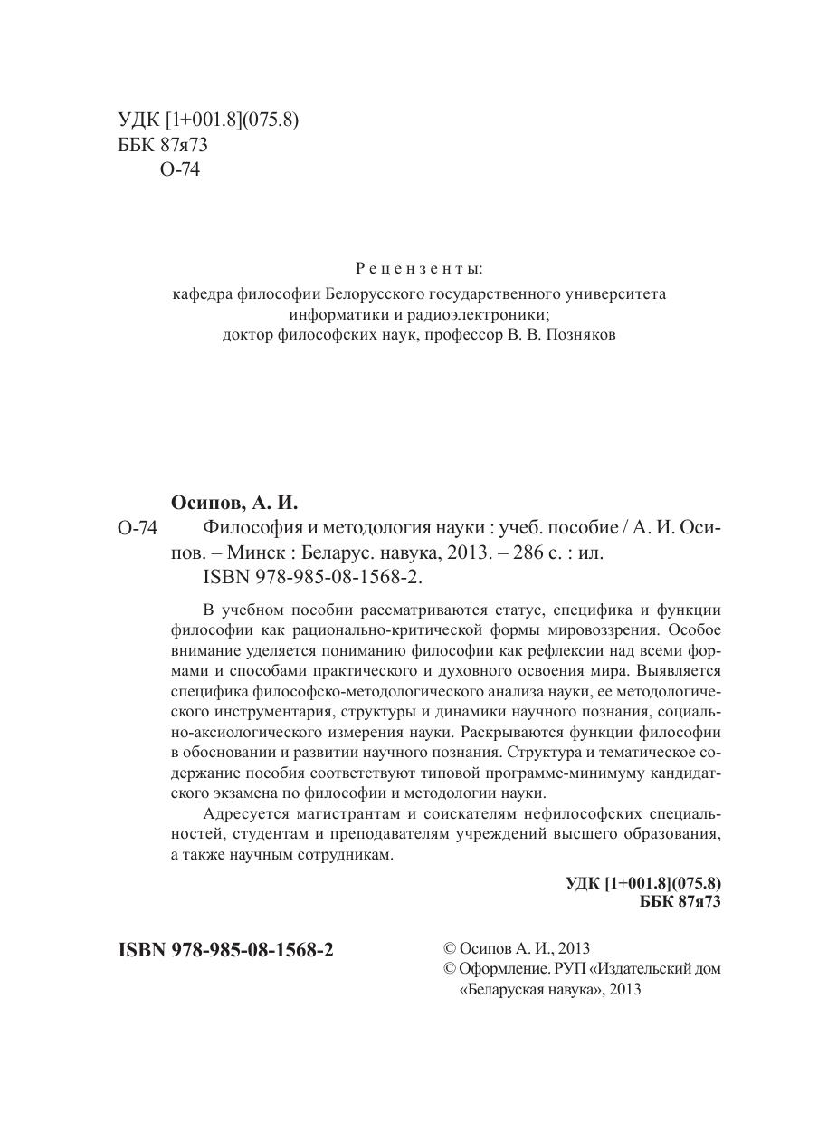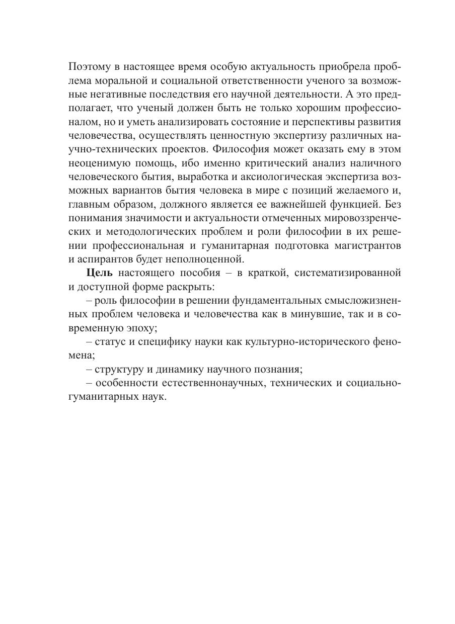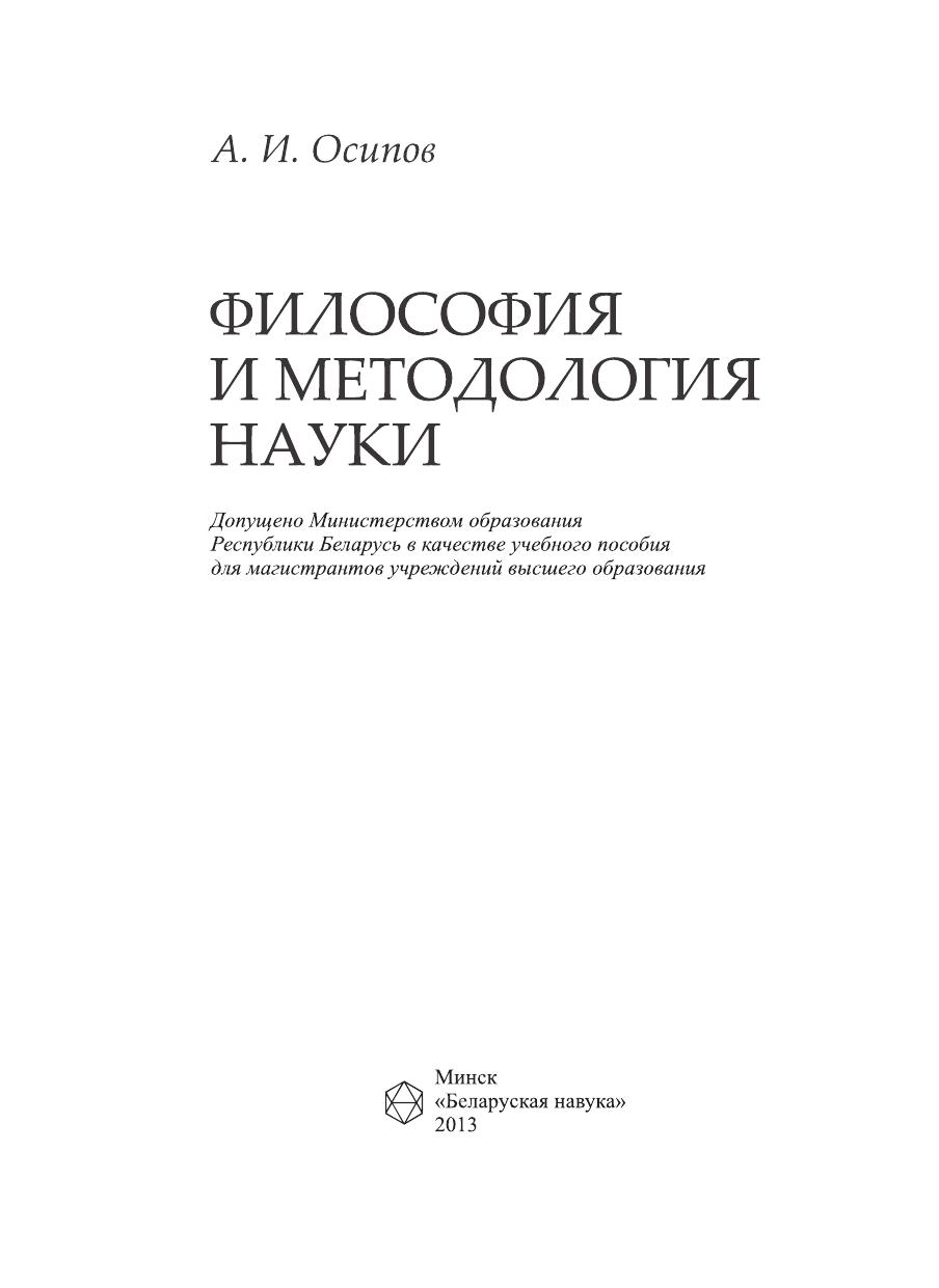 В учебном пособии рассматриваются статус, специфика и функции философии как рационально-критической формы мировоззрения. Особое внимание уделяется пониманию философии как рефлексии над всеми формами и способами практического и духовного освоения мира. Выявляется специфика философско-методологического анализа науки, ее методологического инструментария, структуры и динамики научного познания, социально-аксиологического измерения науки. Раскрываются функции философии в обосновании и развитии научного познания. Структура и тематическое содержание пособия соответствуют типовой программе-минимуму кандидатского экзамена по философии и методологии науки. Адресуется магистрантам и соискателям нефилософских специальностей, студентам и преподавателям учреждений высшего образования, а также научным сотрудникам.