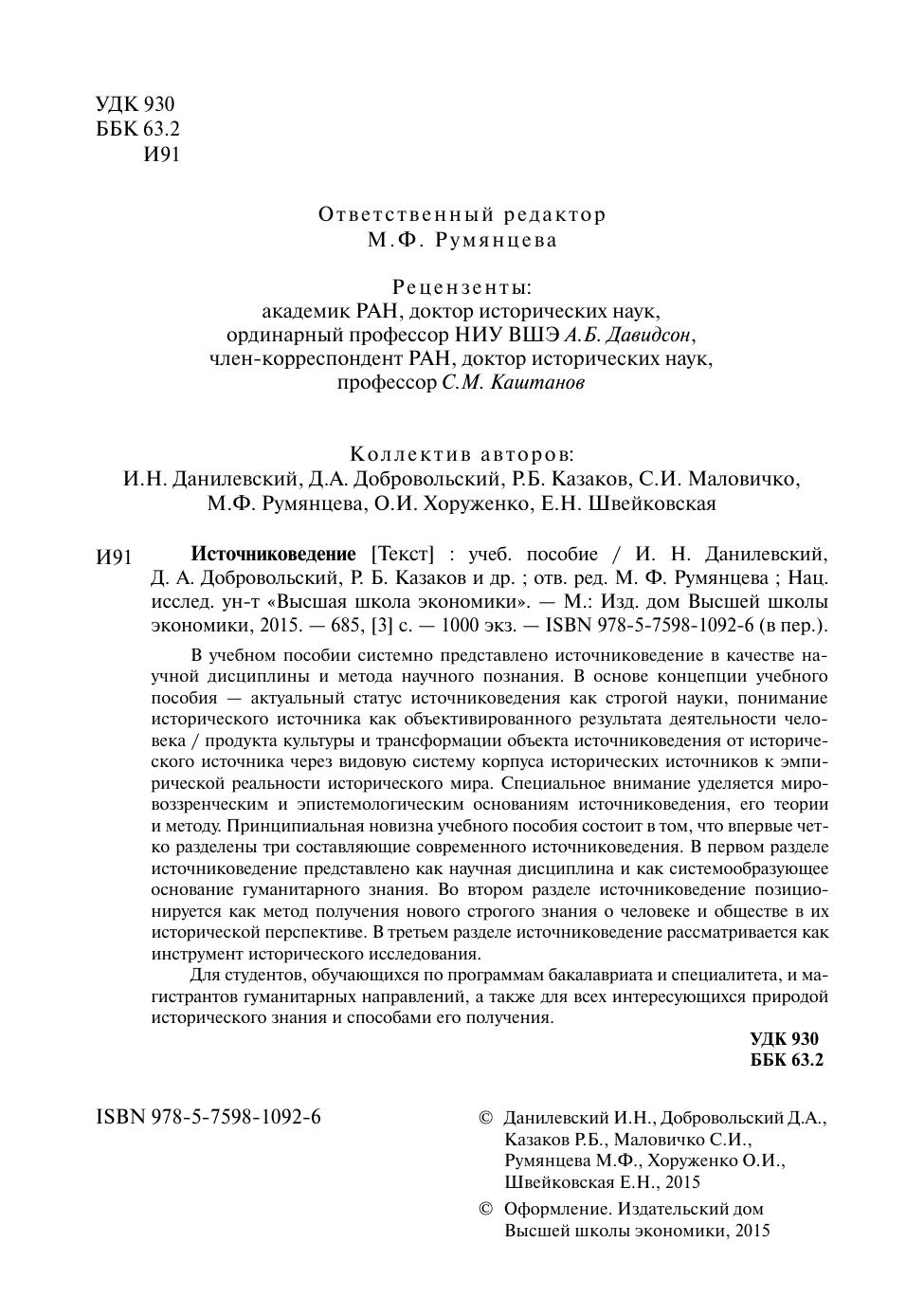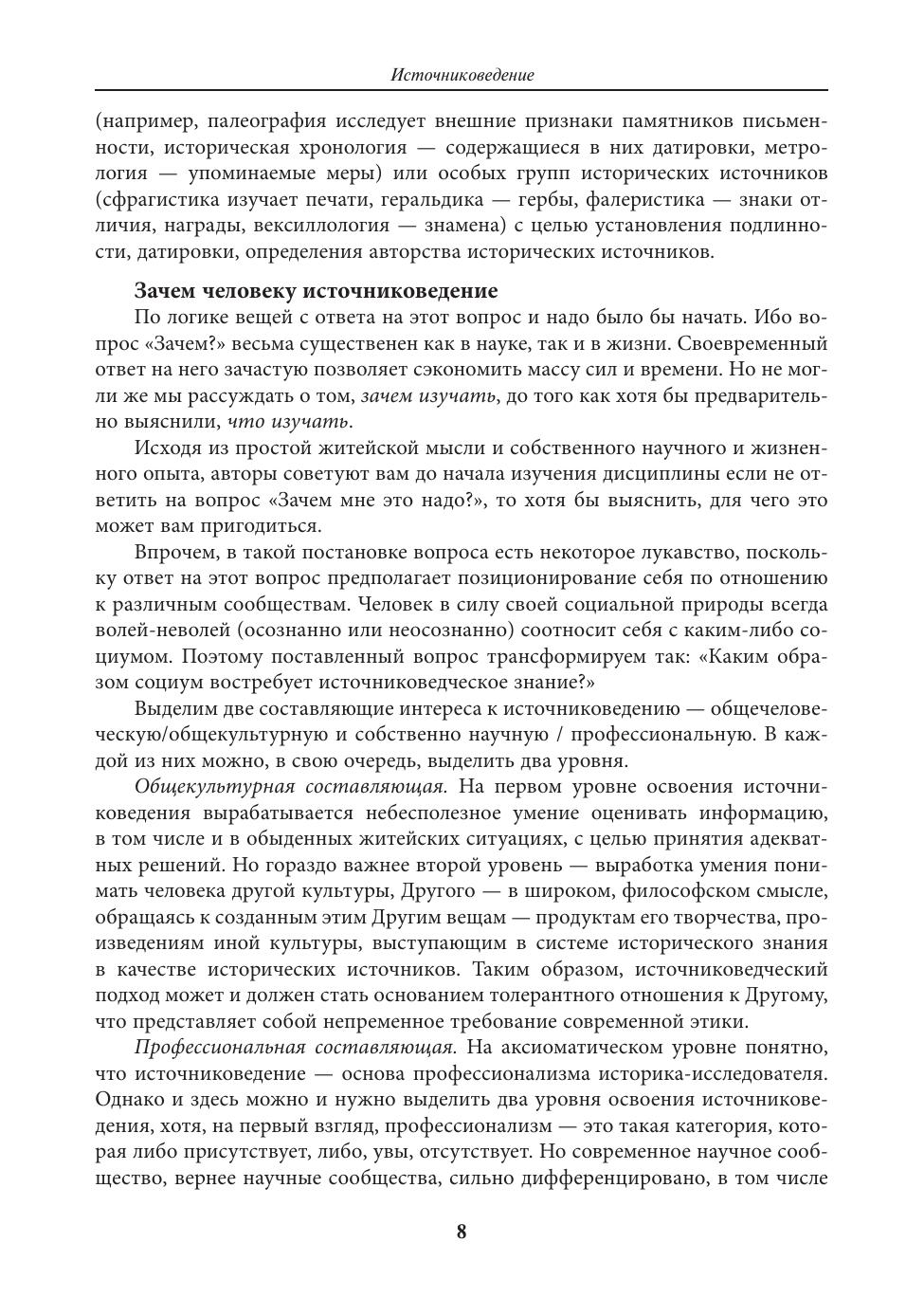 В учебном пособии системно представлено источниковедение в качестве научной дисциплины и метода научного познания. В основе концепции учебного пособия — актуальный статус источниковедения как строгой науки, понимание исторического источника как объективированного результата деятельности человека / продукта культуры и трансформации объекта источниковедения от исторического источника через видовую систему корпуса исторических источников к эмпирической реальности исторического мира. Специальное внимание уделяется мировоззренческим и эпистемологическим основаниям источниковедения, его теории и методу. Принципиальная новизна учебного пособия состоит в том, что впервые четко разделены три составляющие современного источниковедения. В первом разделе источниковедение представлено как научная дисциплина и как системообразующее основание гуманитарного знания. Во втором разделе источниковедение позиционируется как метод получения нового строгого знания о человеке и обществе в их исторической перспективе. В третьем разделе источниковедение рассматривается как инструмент исторического исследования. Для студентов, обучающихся по программам бакалавриата и специалитета, и магистрантов гуманитарных направлений, а также для всех интересующихся природой исторического знания и способами его получения.