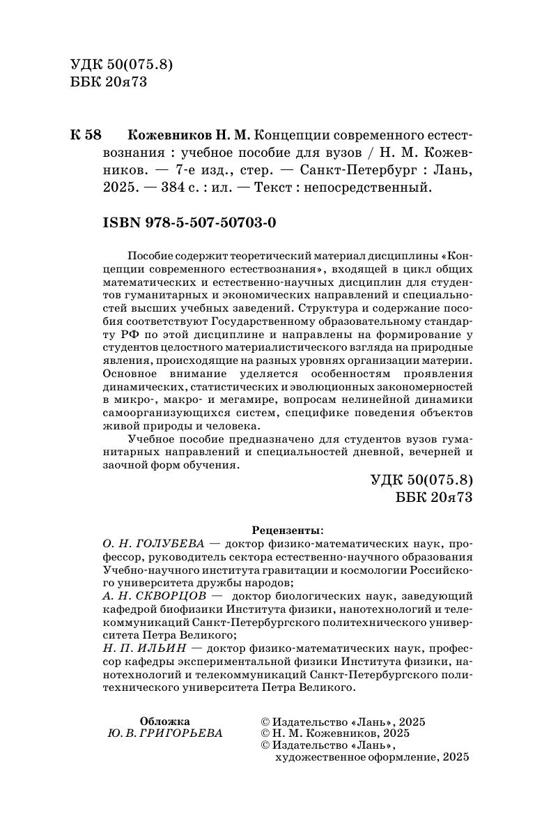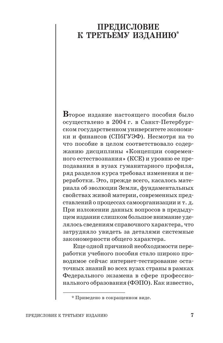 Пособие содержит теоретический материал дисциплины "Концепции современного естествознания", входящей в цикл общих математических и естественнонаучных дисциплин для студентов гуманитарных и экономических направлений и специальностей высших учебных заведений. Структура и содержание пособия соответствуют Государственному образовательному стандарту РФ по этой дисциплине и направлены на формирование у студентов целостного материалистического взгляда на природные явления, происходящие на разных уровнях организации материи. Основное внимание уделяется особенностям проявления динамических, статистических и эволюционных закономерностей в микро-, макро- и мегамире, вопросам нелинейной динамики самоорганизующихся систем, специфике поведения объектов живой природы и человека. Учебное пособие предназначено для студентов гуманитарных направлений и специальностей дневной, вечерней и заочной формы обучения.