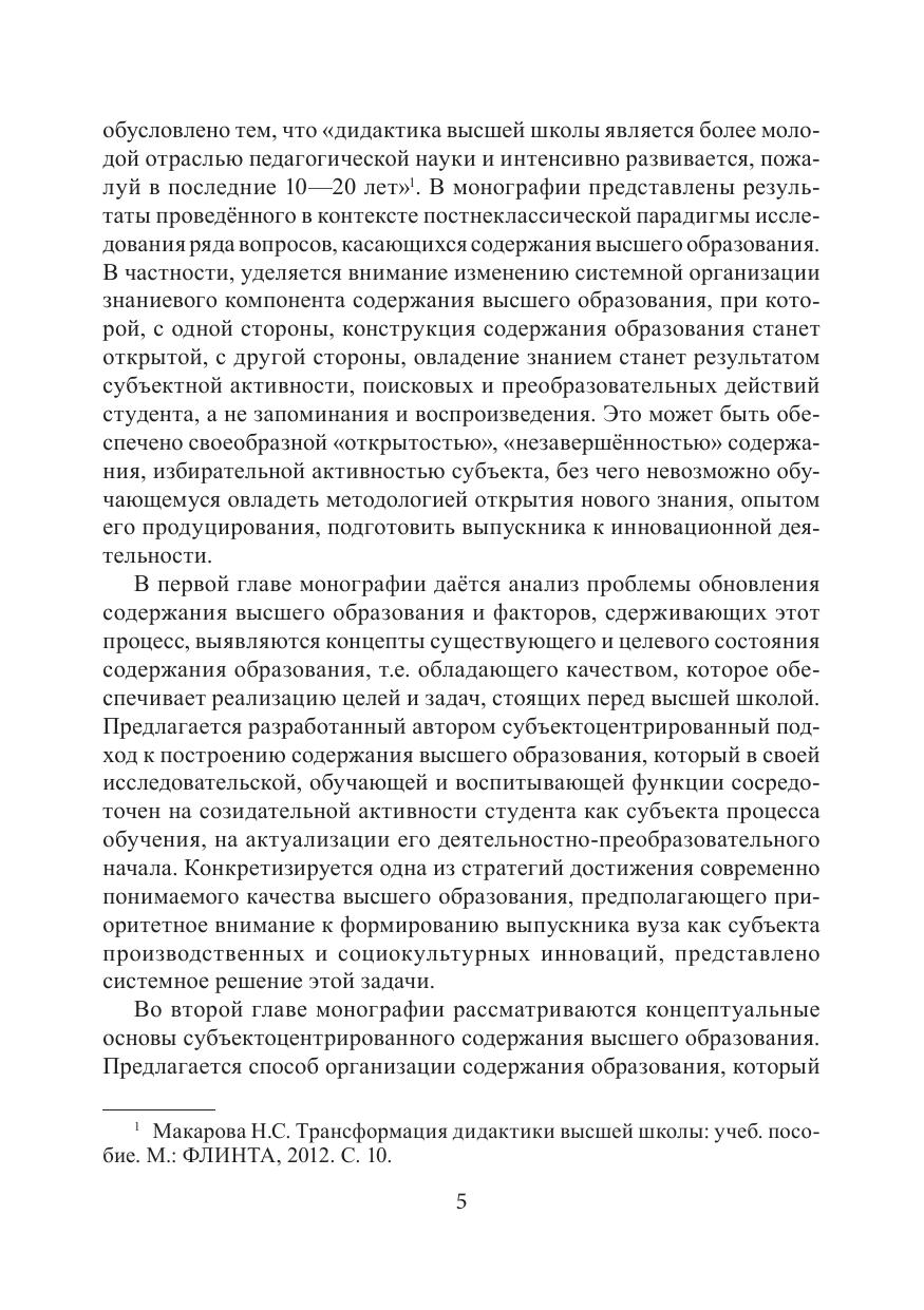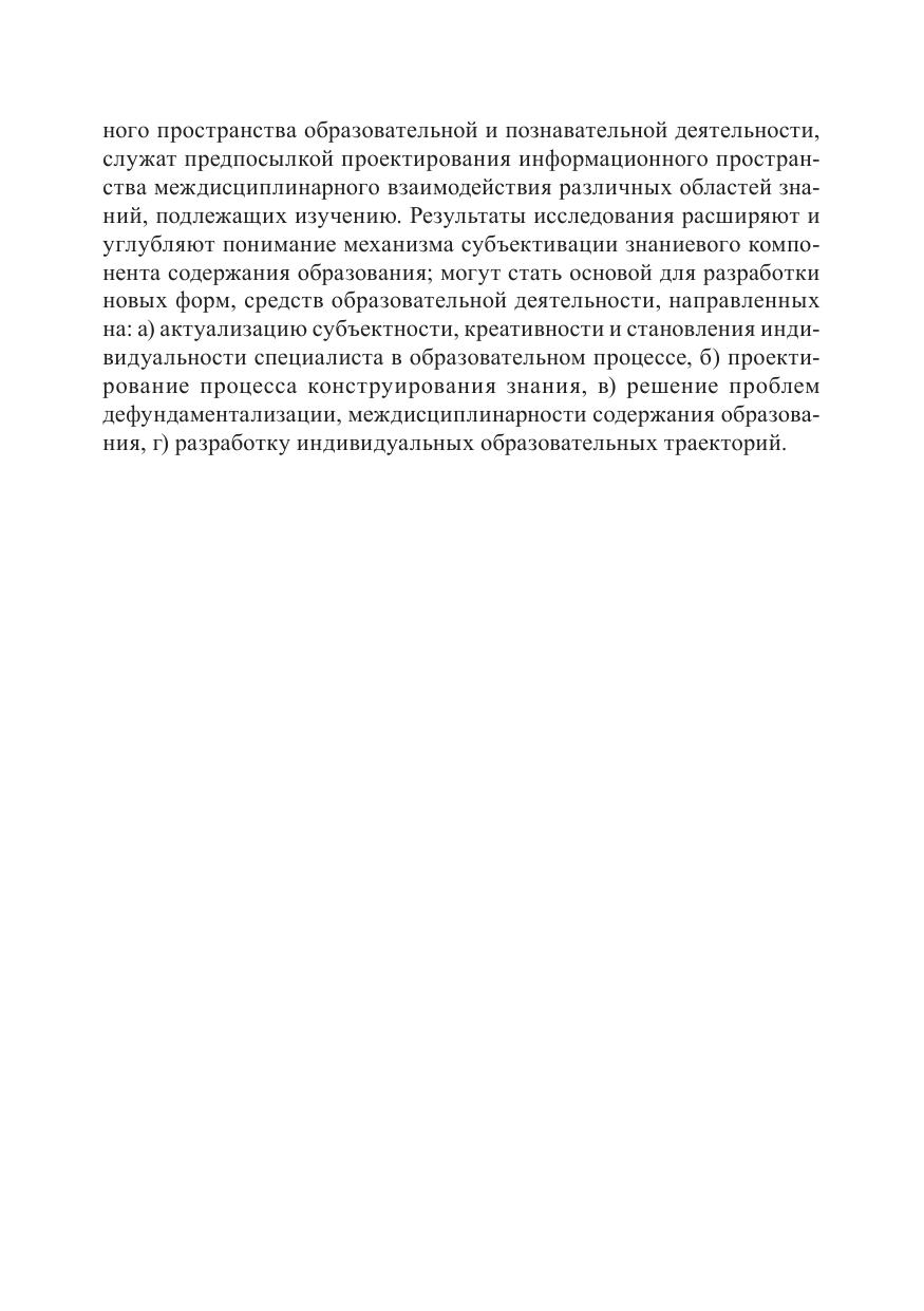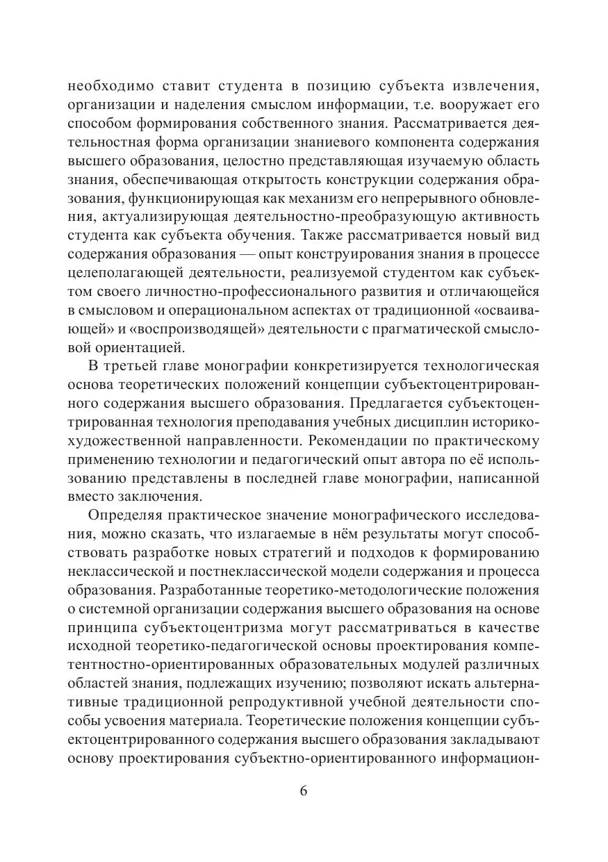 В монографии освещаются результаты исследования процесса обновления содержания образования, осуществляемого в условиях кризиса современной высшей школы; рассматриваются теоретические и практические аспекты концептуальных положений, которые обосновывают: а) решение проблемы обновления содержания высшего образования, когда оно по самой своей конструкции инициирует субъектную позицию студента, а также моделирует условия эффективного решения специалистом профессиональных задач в современной знаниевой реальности; б) принципы и конкретные процедуры построения знаниевого компонента содержания высшего образования, обеспечивающие его деятельностную форму, благодаря которой это содержание становится предметом деятельности, проходя стадии осмысления, контекстуализации, рефлексии, использования в качестве ориентировочной основы действия, переноса в новые ситуации. В научный оборот вводится система новых понятий, которая позволяет на методологических основаниях постнеклассической парадигмы системно осмысливать, описывать, проектировать изменения в процессе обучения, необходимые для подготовки специалиста, соответствующего современным требованиям.