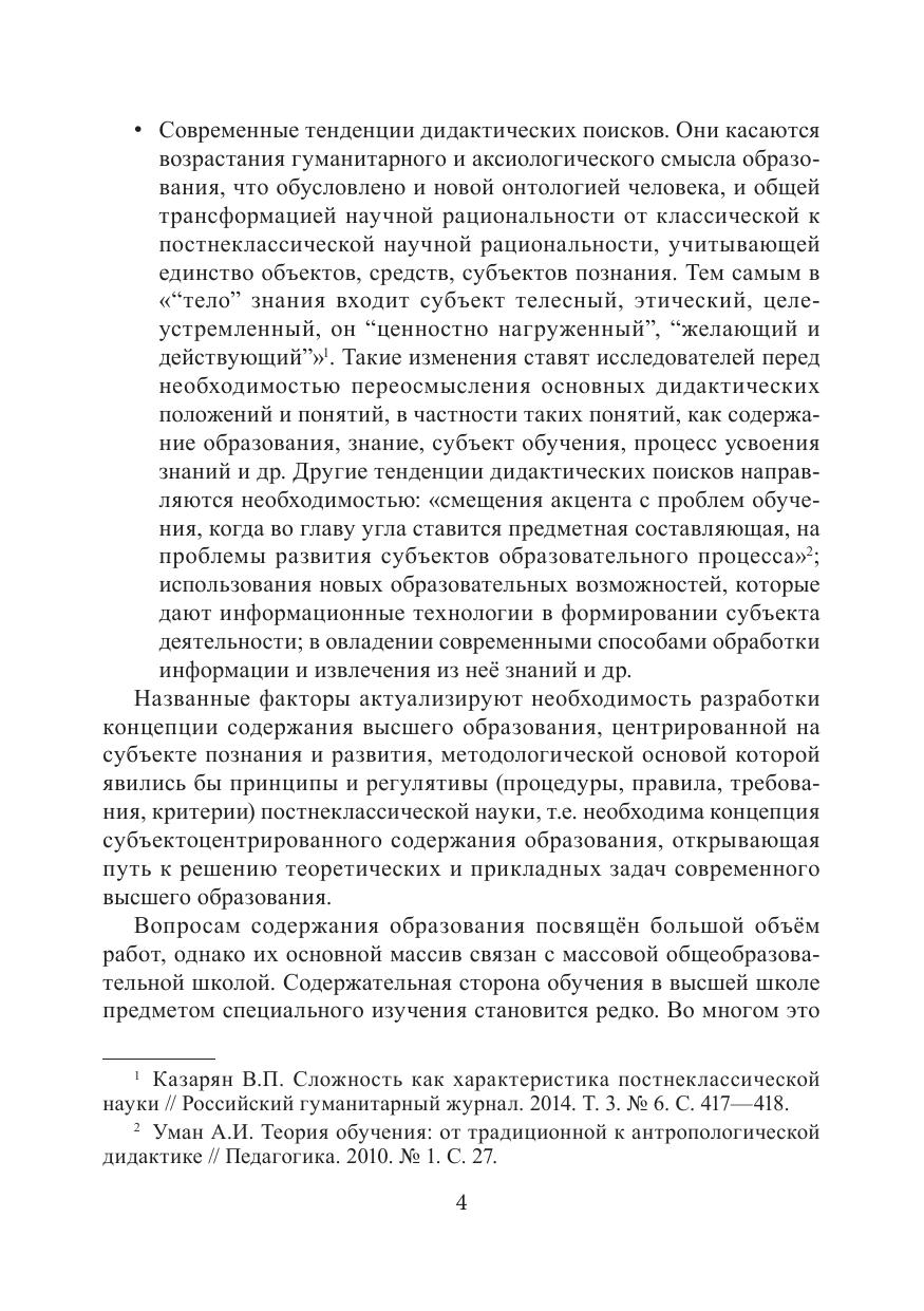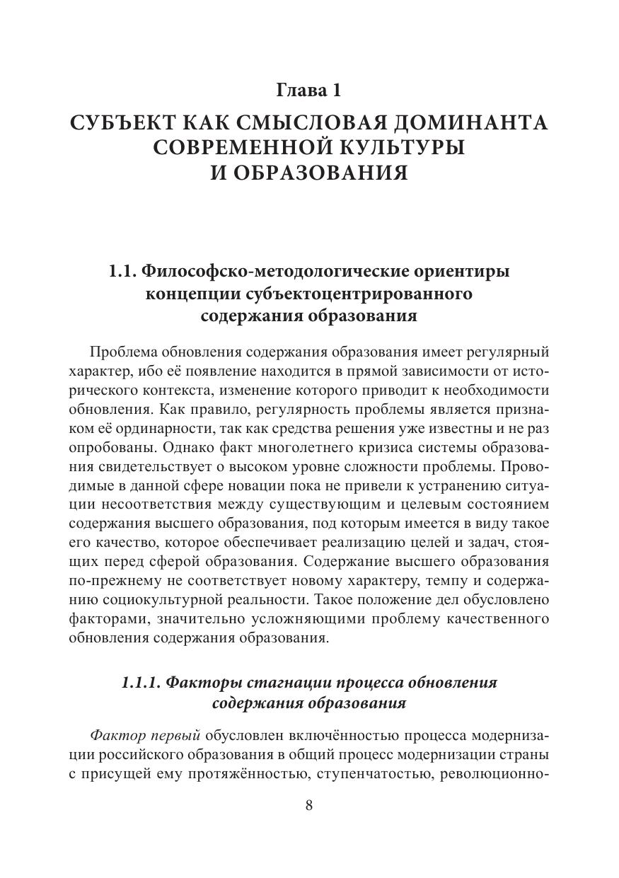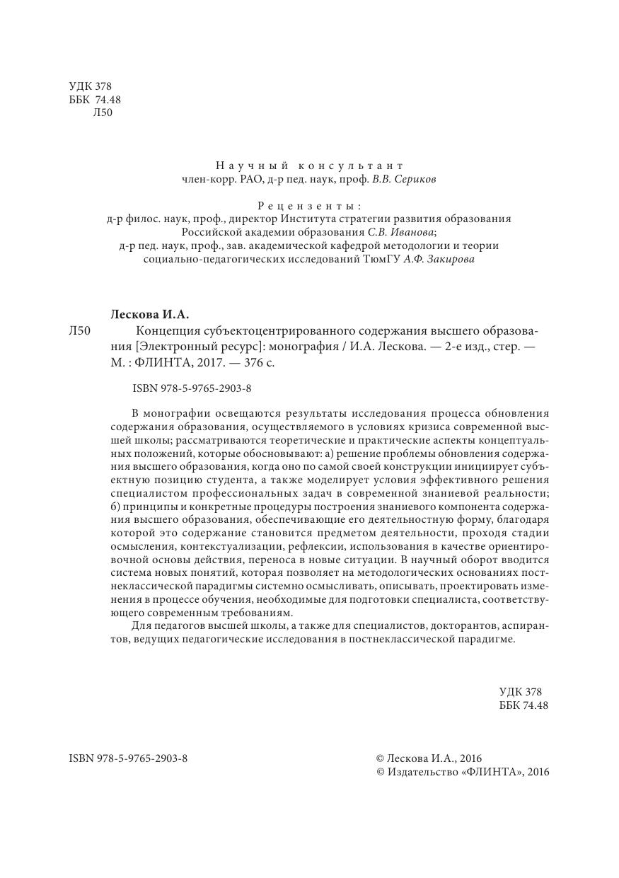 В монографии освещаются результаты исследования процесса обновления содержания образования, осуществляемого в условиях кризиса современной высшей школы; рассматриваются теоретические и практические аспекты концептуальных положений, которые обосновывают: а) решение проблемы обновления содержания высшего образования, когда оно по самой своей конструкции инициирует субъектную позицию студента, а также моделирует условия эффективного решения специалистом профессиональных задач в современной знаниевой реальности; б) принципы и конкретные процедуры построения знаниевого компонента содержания высшего образования, обеспечивающие его деятельностную форму, благодаря которой это содержание становится предметом деятельности, проходя стадии осмысления, контекстуализации, рефлексии, использования в качестве ориентировочной основы действия, переноса в новые ситуации. В научный оборот вводится система новых понятий, которая позволяет на методологических основаниях постнеклассической парадигмы системно осмысливать, описывать, проектировать изменения в процессе обучения, необходимые для подготовки специалиста, соответствующего современным требованиям.