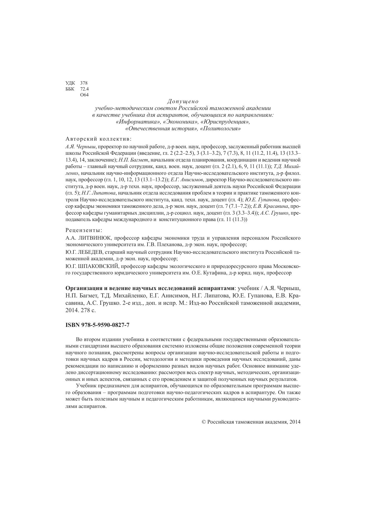 Гриф: Допущено учебно-методическим советом Российской таможенной академии в качестве учебника для аспирантов, обучающихся по направлениям: «Информатика», «Экономика», «Юриспруденция», «Отечественная история», «Политология»