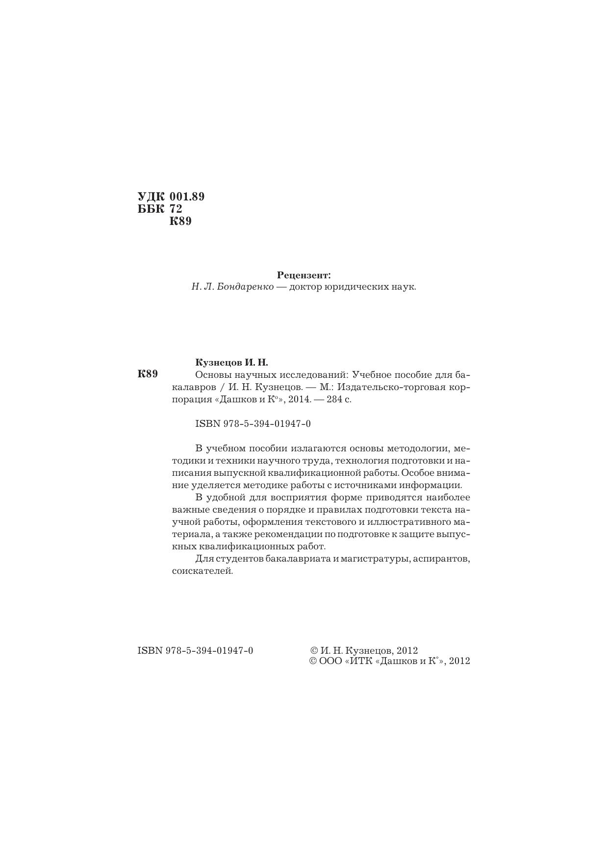 В учебном пособии излагаются основы методологии, методики и техники научного труда, технология подготовки и написания выпускной квалификационной работы. Особое внимание уделяется методике работы с источниками информации. В удобной для восприятия форме приводятся наиболее важные сведения о порядке и правилах подготовки текста научной работы, оформления текстового и иллюстративного материала, а также рекомендации по подготовке к защите выпускных квалификационных работ. Для студентов бакалавриата и магистратуры, аспирантов, соискателей.