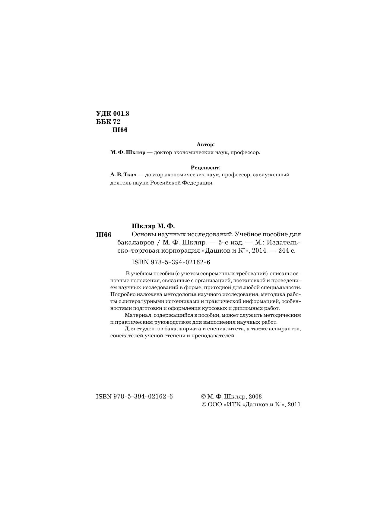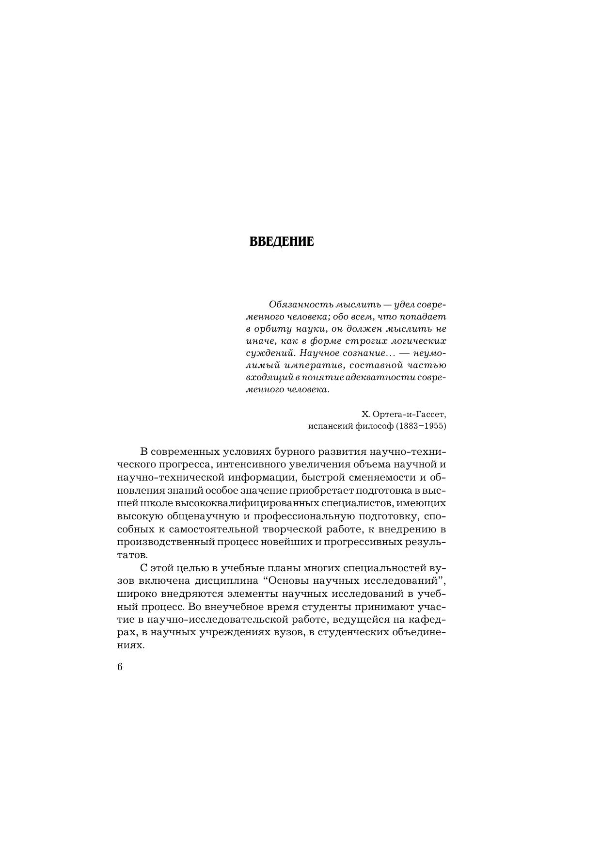 В учебном пособии (с учетом современных требований) описаны основные положения, связанные с организацией, постановкой и проведением научных исследований в форме, пригодной для любой специальности. Подробно изложена методология научного исследования, методика работы с литературными источниками и практической информацией, особенностями подготовки и оформления курсовых и дипломных работ. Материал, содержащийся в пособии, может служить методическими практическим руководством для выполнения научных работ. Для студентов бакалавриата и специалитета, а также аспирантов, соискателей ученой степени и преподавателей.