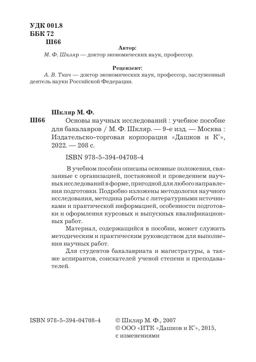 В учебном пособии с учетом современных требований описаны основные положения, связанные с организацией, постановкой и проведением научных исследований в форме, пригодной для любого направления подготовки. Подробно изложены методология научного исследования, методика работы с литературными источниками и практической информацией, особенности подготовки и оформлении курсовых и выпускных квалификационных работ. Материал, содержащийся в пособии, может служить методическим и практическим руководством для выполнения научных работ. Для студентов бакалавриата и магистратуры, а также аспирантов, соискателей ученой степени и преподавателей.