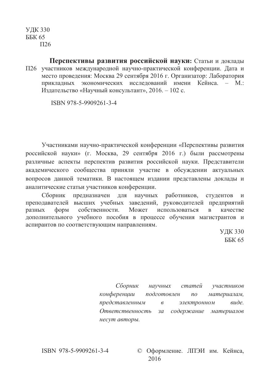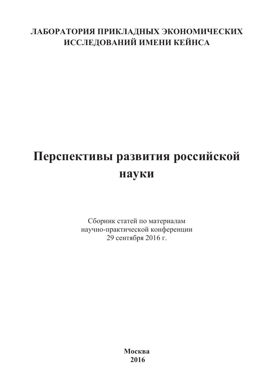 Перспективы развития российской науки: Статьи и доклады участников международной научно-практической конференции. Дата и место проведения: Москва 29 сентября 2016 г. Организатор: Лаборатория прикладных экономических исследований имени Кейнса