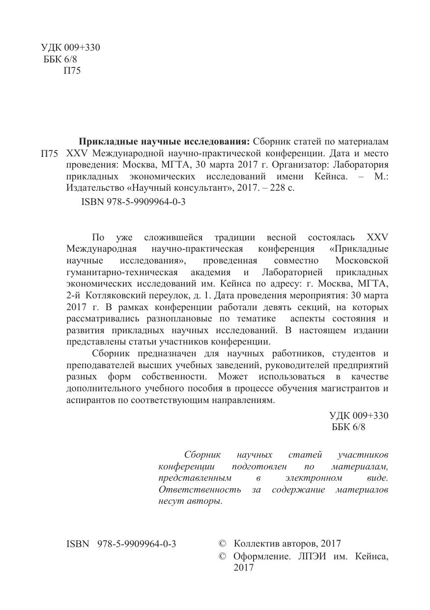 По уже сложившейся традиции весной состоялась XXV Международная научно-практическая конференция «Прикладные научные исследования», проведенная совместно Московской гуманитарно-техническая академия и Лабораторией прикладных экономических исследований им. Кейнса по адресу: г. Москва, МГТА, 2-й Котляковский переулок, д. 1. Дата проведения мероприятия: 30 марта 2017 г. В рамках конференции работали девять секций, на которых рассматривались разноплановые по тематике аспекты состояния и развития прикладных научных исследований. В настоящем издании представлены статьи участников конференции.