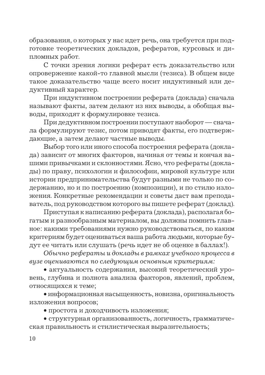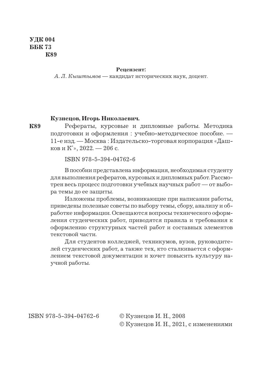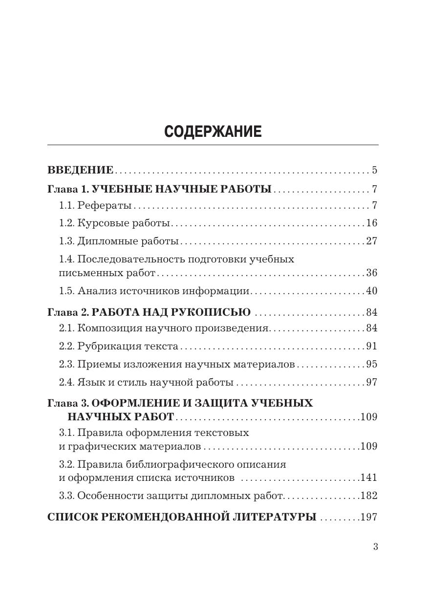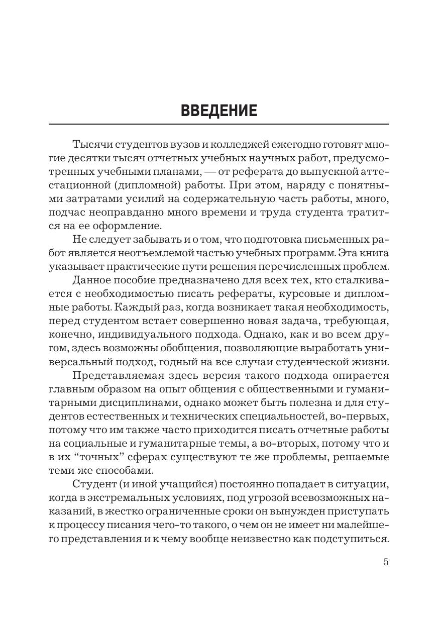 В пособии представлена информация, необходимая студенту для выполнения рефератов, курсовых и дипломных работ. Рассмотрен весь процесс подготовки учебных научных работ — от выбора темы до ее защиты. Также в пособии содержатся рекомендации по оформлению всех видов работ в соответствии с требованиями межгосударственного стандарта ГОСТ 7.1?2003. Изложены проблемы, возникающие при написании работы, приведены полезные советы по выбору темы, сбору, анализу и обработке информации. В книге освещаются вопросы технического оформления студенческих работ, приводятся правила и требования к оформлению структурных частей работ и составных элементов текстовой части. Для студентов колледжей, техникумов, вузов, руководителей студенческих работ, а также тех, кто сталкивается с оформлением текстовой документации и хочет повысить культуру научной работы.