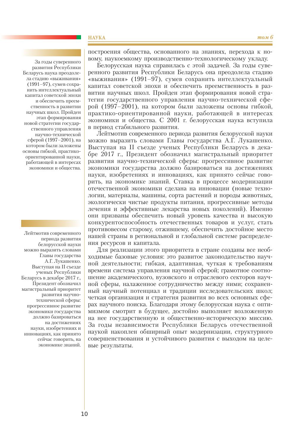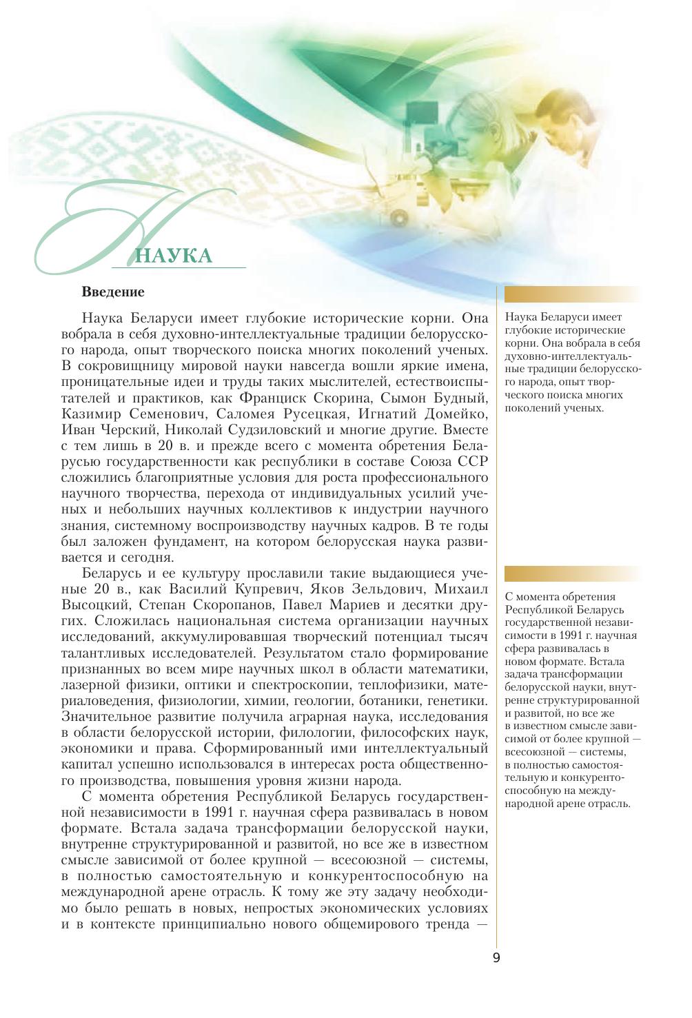 В томе приводятся обширные сведения о становлении, развитии и достижениях белорусской науки за годы независимости. Показано развитие информационного общества. Издание рассчитано на широкий круг читателей: государственных служащих, ученых, преподавателей, журналистов, студентов, учащихся колледжей и учреждений общего среднего образования, всех, кому интересна информация о современной Беларуси. В издании помещено 624 цветные иллюстрации, 20 схем и таблиц.