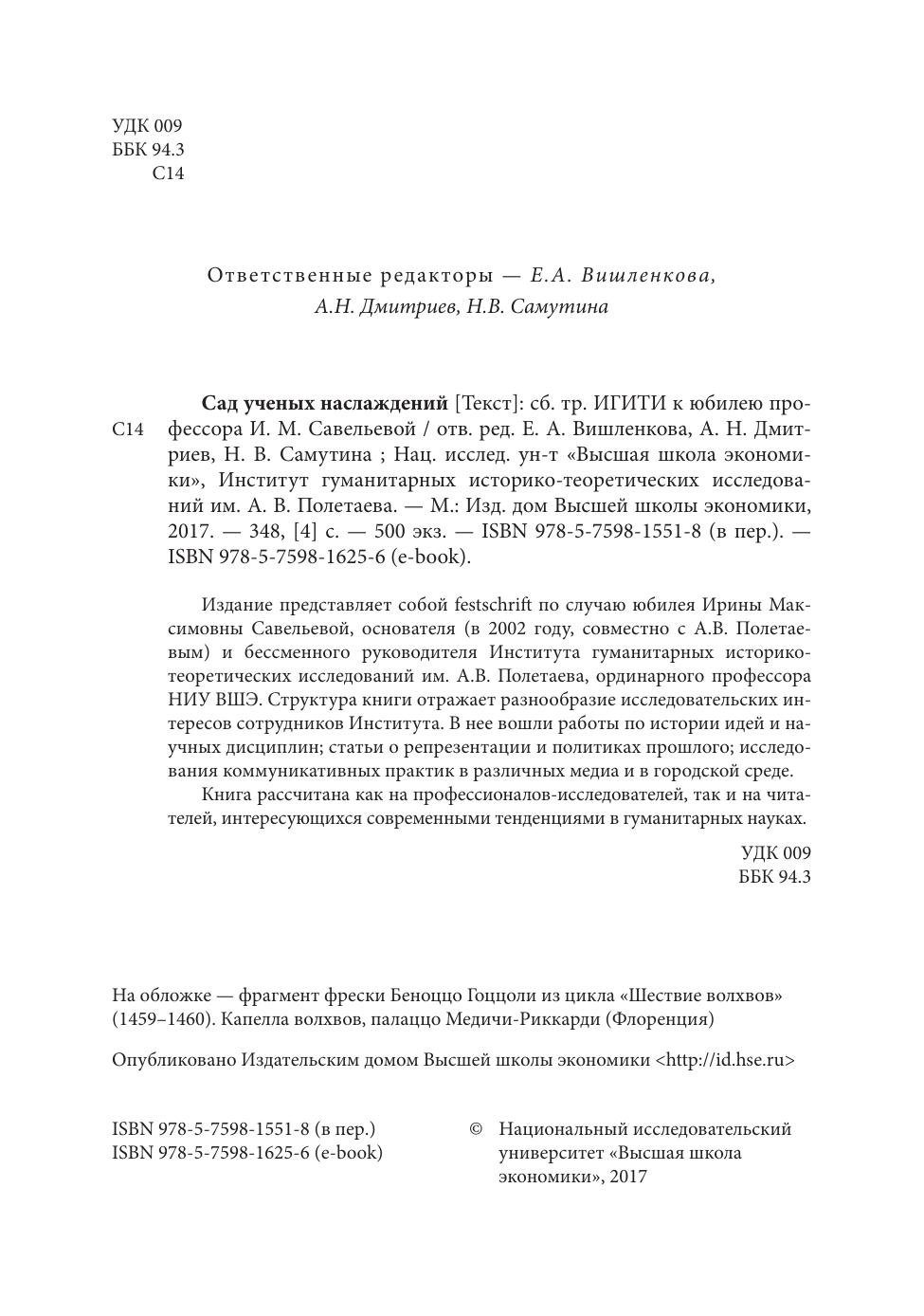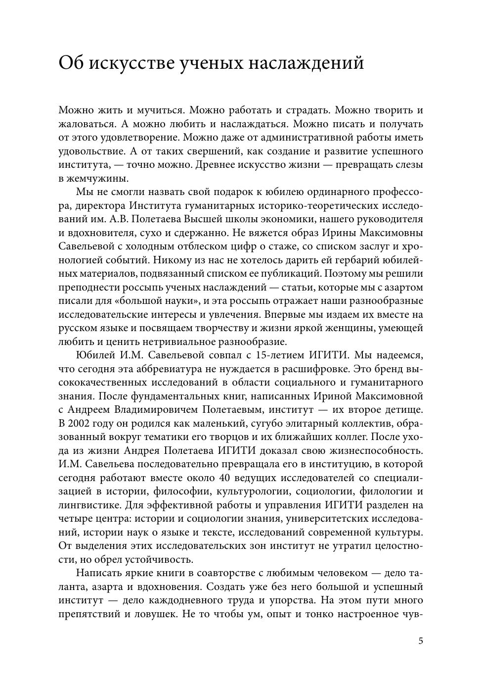 Издание представляет собой festschrift по случаю юбилея Ирины Максимовны Савельевой, основателя (в 2002 году, совместно с А.В. Полетаевым) и бессменного руководителя Института гуманитарных историкотеоретических исследований им. А.В. Полетаева, ординарного профессора НИУ ВШЭ. Структура книги отражает разнообразие исследовательских интересов сотрудников Института. В нее вошли работы по истории идей и научных дисциплин; статьи о репрезентации и политиках прошлого; исследования коммуникативных практик в различных медиа и в городской среде. Книга рассчитана как на профессионаловисследователей, так и на читателей, интересующихся современными тенденциями в гуманитарных науках.