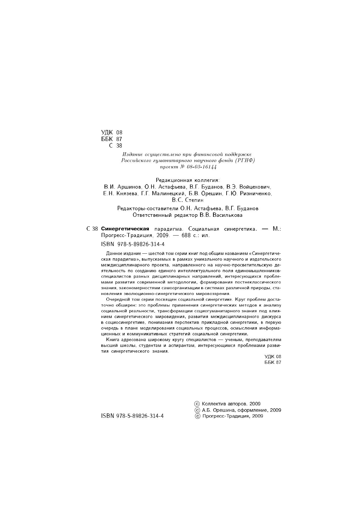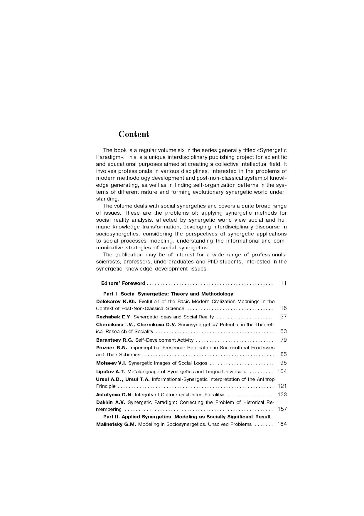Данное издание — шестой том серии книг под общим названием «Синергетическая парадигма», выпускаемых в рамках уникального научного и издательского междисциплинарного проекта, направленного на научно-просветительскую деятельность по созданию единого интеллектуального поля единомышленников-специалистов разных дисциплинарных направлений, интересующихся проблемами развития современной методологии, формирования постнеклассического знания, закономерностями самоорганизации в системах различной природы, становления эволюционно-синергетического мировоззрения.