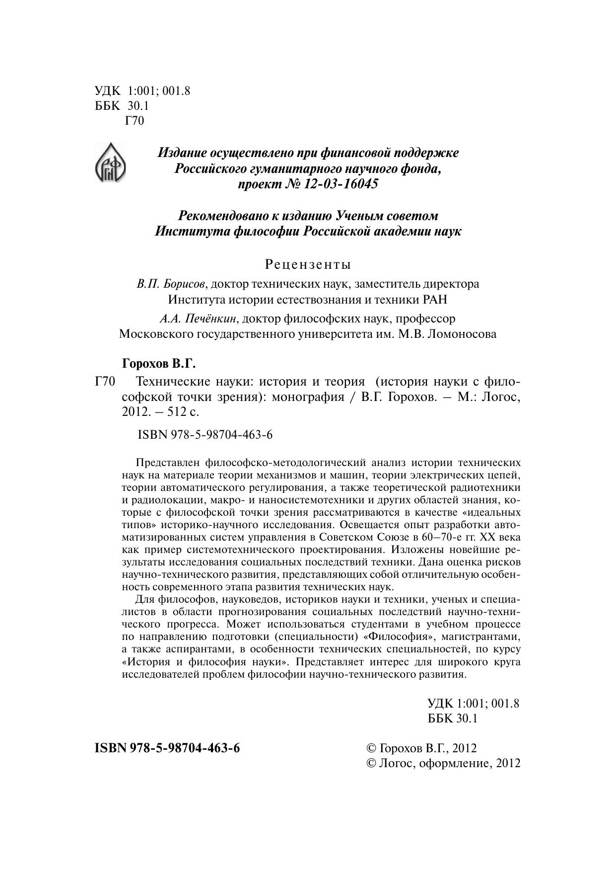 Представлен философско-методологический анализ истории технических наук на материале теории механизмов и машин, теории электрических цепей, теории автоматического регулирования, а также теоретической радиотехники и радиолокации, макро- и наносистемотехники и других областей знания, которые с философской точки зрения рассматриваются в качестве «идеальных типов» историко-научного исследования. Освещается опыт разработки автоматизированных систем управления в Советском Союзе в 60–70-е гг. ХХ века как пример системотехнического проектирования. Изложены новейшие результаты исследования социальных последствий техники. Дана оценка рисков научно-технического развития, представляющих собой отличительную особенность современного этапа развития технических наук. Для философов, науковедов, историков науки и техники, ученых и специалистов в области прогнозирования социальных последствий научно-технического прогресса. Может использоваться студентами в учебном процессе по направлению подготовки (специальности) «Философия», магистрантами, а также аспирантами, в особенности технических специальностей, по курсу «История и философия науки». Представляет интерес для широкого круга исследователей проблем философии научно-технического развития.