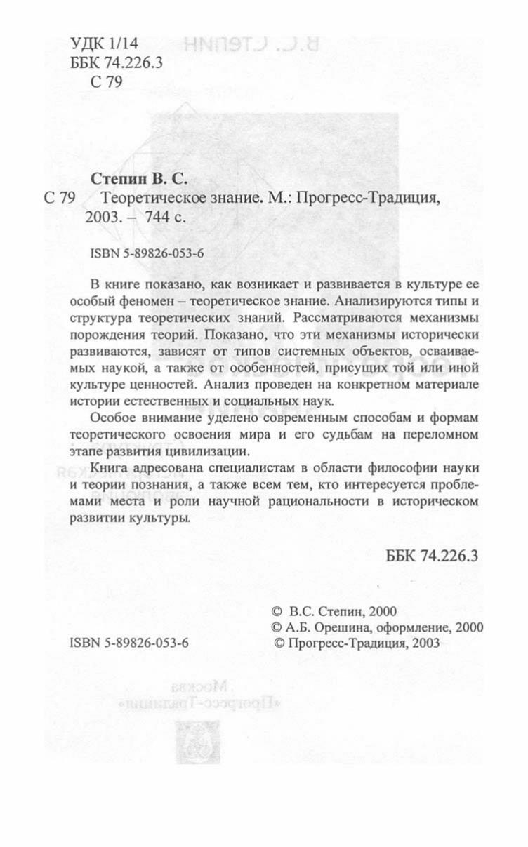В книге показано, как возникает и развивается в культуре ее особый феномен - теоретическое знание. Анализируются типы и структура теоретических знаний. Рассматриваются механизмы порождения теорий. Показано, что эти механизмы исторически развиваются, зависят от типов системных объектов, осваиваемых наукой, а также от особенностей, присущих той или иной культуре ценностей. Анализ проведен на конкретном материале истории естественных и социальных наук. Особое внимание уделено современным способам и формам теоретического освоения мира и его судьбам на переломном этапе развития цивилизации. Книга адресована специалистам в области философии науки и теории познания, а также всем тем, кто интересуется проблемами места и роли научной рациональности в историческом развитии культуры