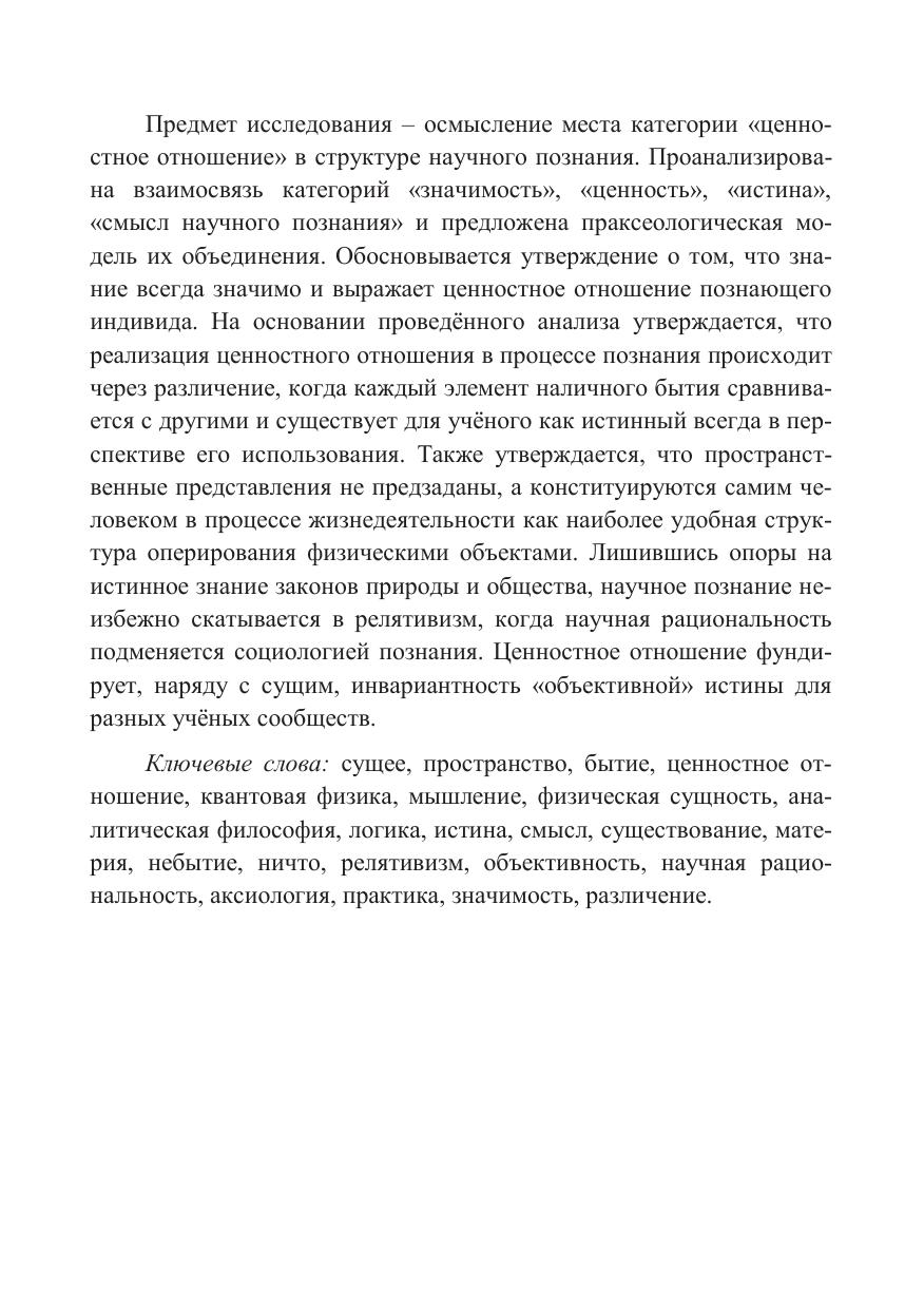 Предмет исследования – осмысление места категории «ценностное отношение» в структуре научного познания. Проанализирована взаимосвязь категорий «значимость», «ценность», «истина», «смысл научного познания» и предложена праксеологическая модель их объединения. Обосновывается утверждение о том, что знание всегда значимо и выражает ценностное отношение познающего индивида.