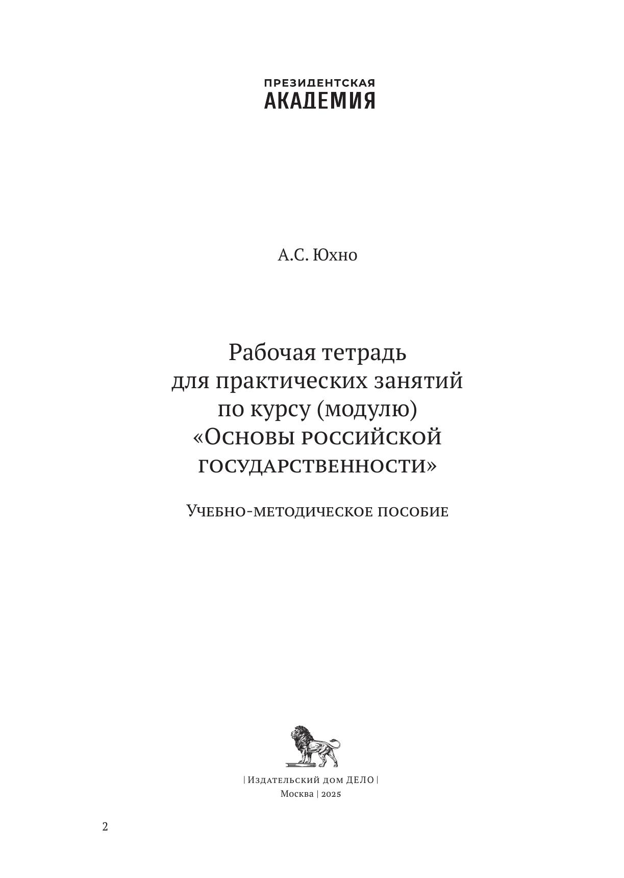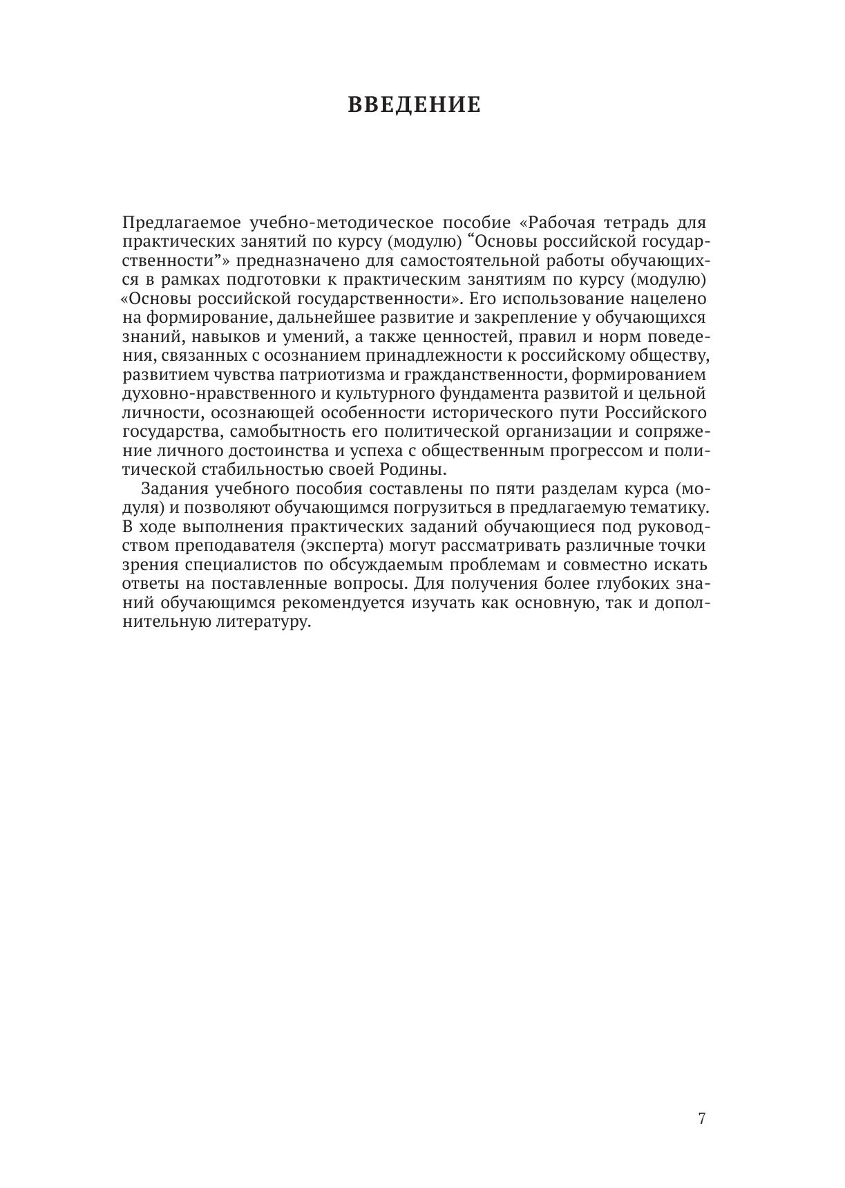 Рабочая тетрадь разработана на основе концепции учебно-методического курса (модуля) «Основы российской государственности», рекомендованного письмами Минобрнауки России от 21.04.2023 МН-11/1516-ПК, от 11.08.2023 МН-11/16Ю-ОП, рабочей программы дисциплины, одобренной на заседании кафедры государствоведения Института государственной службы и управления РАНХиГС (протокол от 31.08.2023 No 1). Рекомендована учебно-методическим советом по направлению «Государственное и муниципальное управление» ФГБОУ ВО «Российская академия народного хозяйства и государственной службы при Президенте Российской Федерации» в качестве учебно-методического пособия для студентов высших учебных заведений. В Рабочей тетради по каждому разделу дисциплины представлены практические задания и вопросы. Учебно-методическое пособие может быть использовано студентами, преподавателями, исследователями и всеми, кто интересуется вопросами российской государственности.