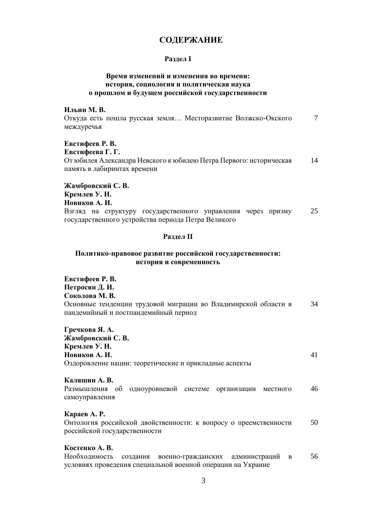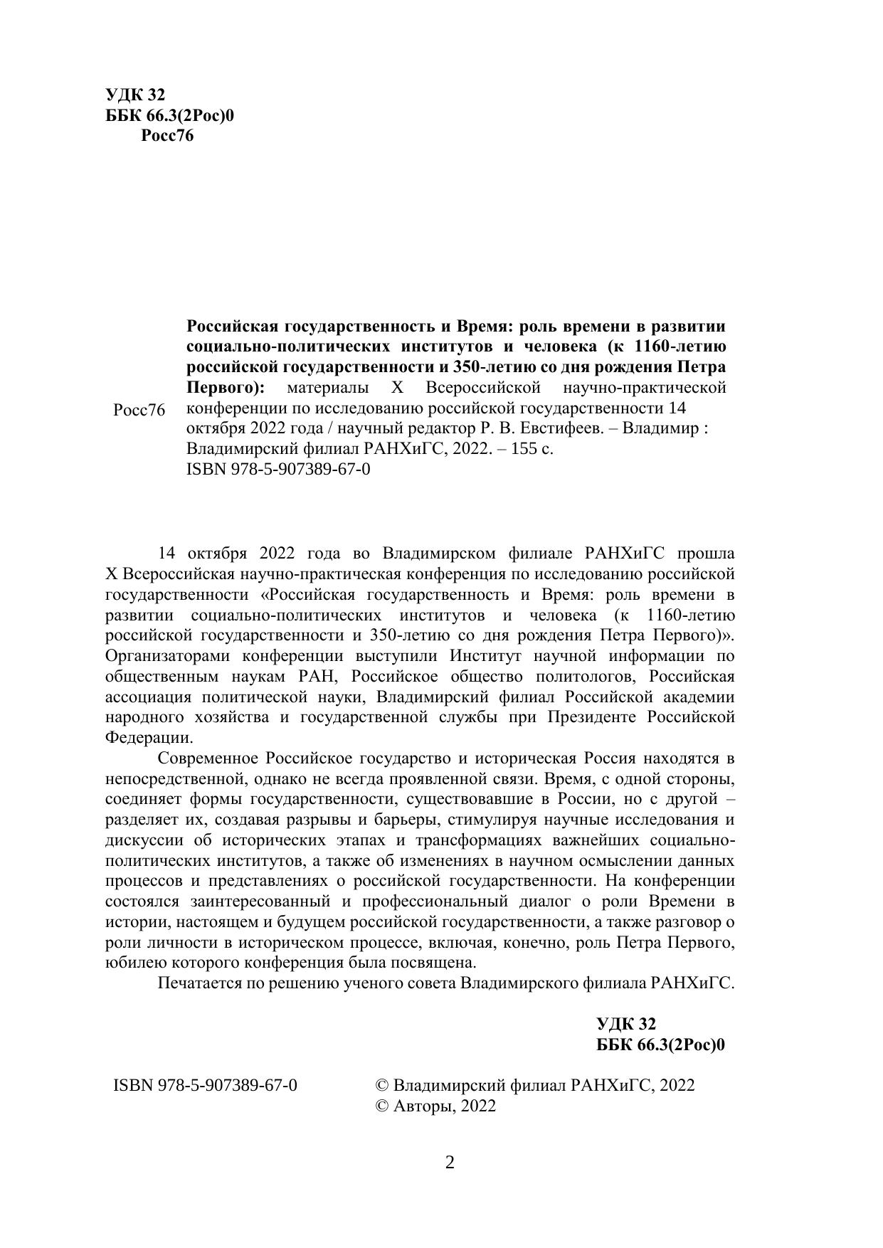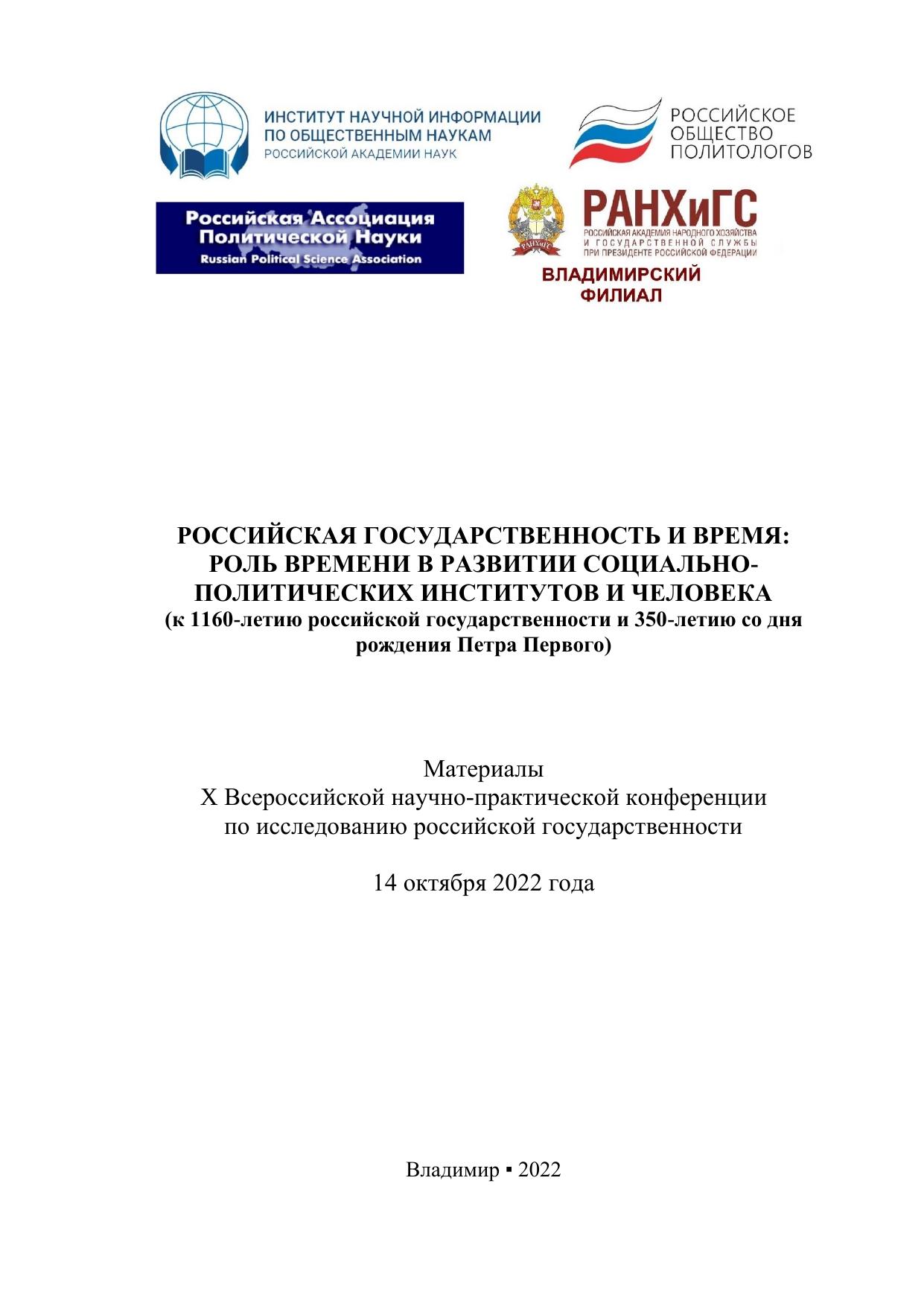 14 октября 2022 года во Владимирском филиале РАНХиГС прошла X Всероссийская научно-практическая конференция по исследованию российской государственности «Российская государственность и Время: роль времени в развитии социально-политических институтов и человека (к 1160-летию российской государственности и 350-летию со дня рождения Петра Первого)». Организаторами конференции выступили Институт научной информации по общественным наукам РАН, Российское общество политологов, Российская ассоциация политической науки, Владимирский филиал Российской академии народного хозяйства и государственной службы при Президенте Российской Федерации. Современное Российское государство и историческая Россия находятся в непосредственной, однако не всегда проявленной связи. Время, с одной стороны, соединяет формы государственности, существовавшие в России, но с другой – разделяет их, создавая разрывы и барьеры, стимулируя научные исследования и дискуссии об исторических этапах и трансформациях важнейших социально-политических институтов, а также об изменениях в научном осмыслении данных процессов и представлениях о российской государственности. На конференции состоялся заинтересованный и профессиональный диалог о роли Времени в истории, настоящем и будущем российской государственности, а также разговор о роли личности в историческом процессе, включая, конечно, роль Петра Первого, юбилею которого конференция была посвящена. Печатается по решению ученого совета Владимирского филиала РАНХиГС.