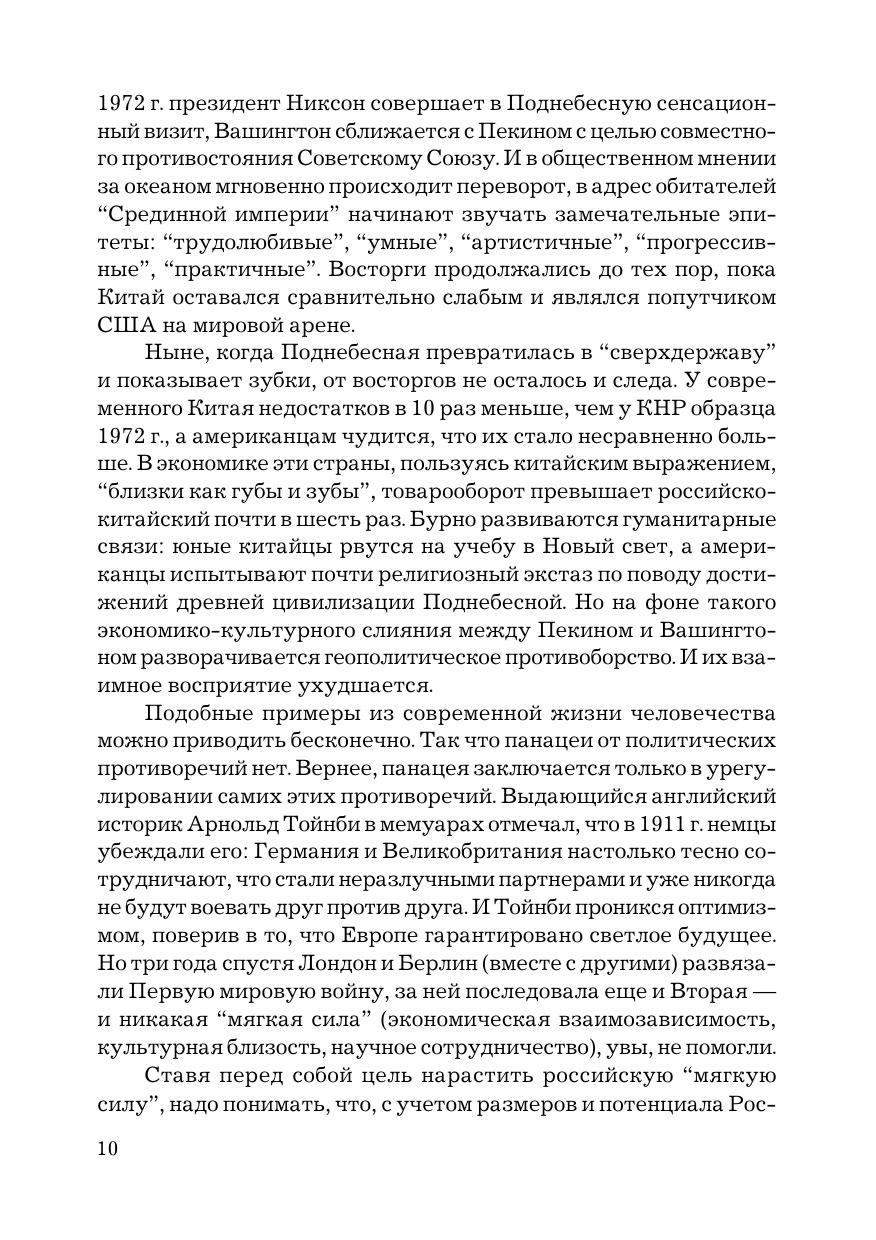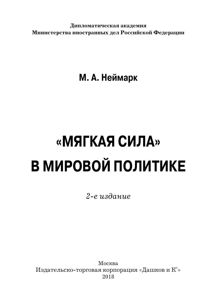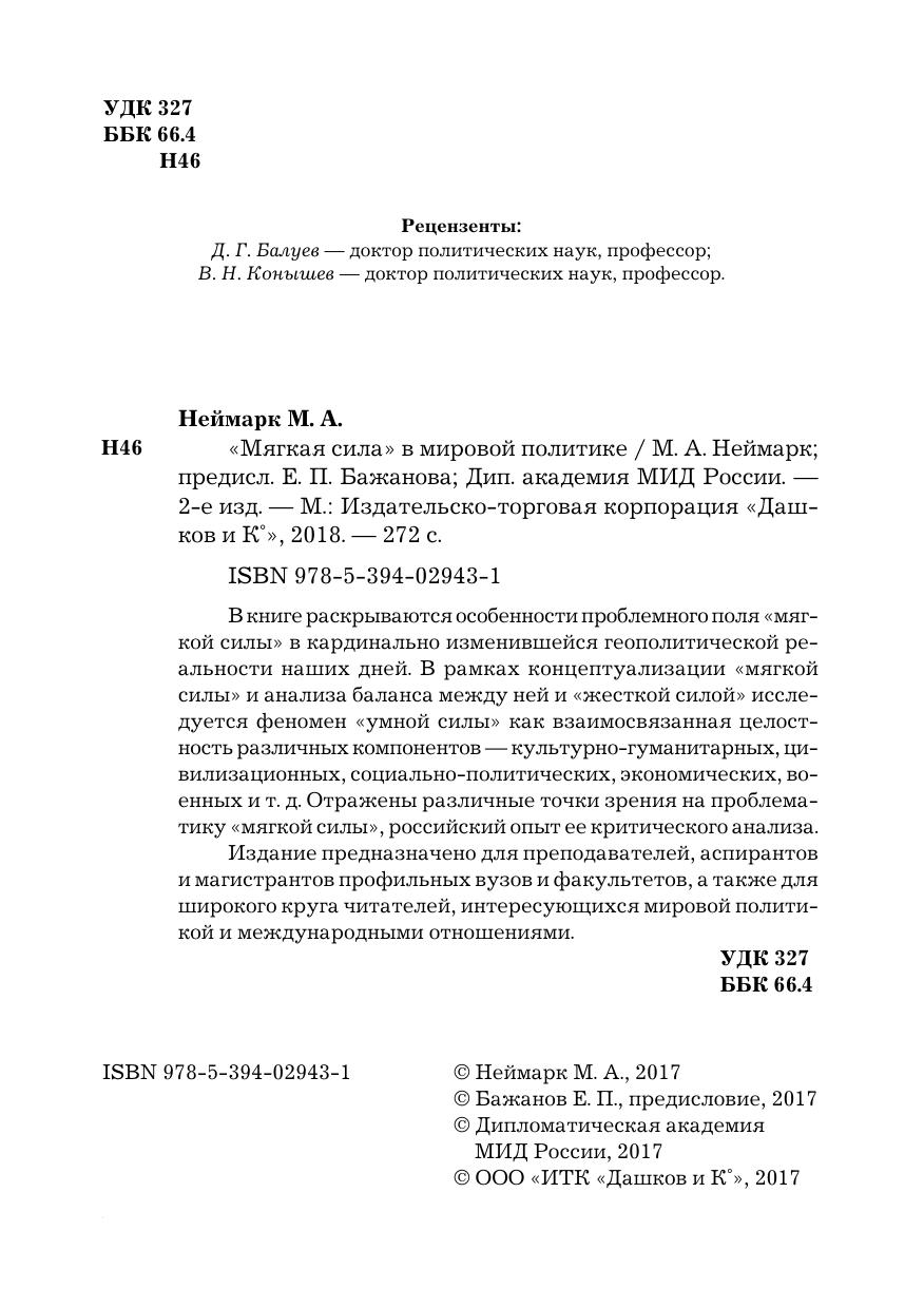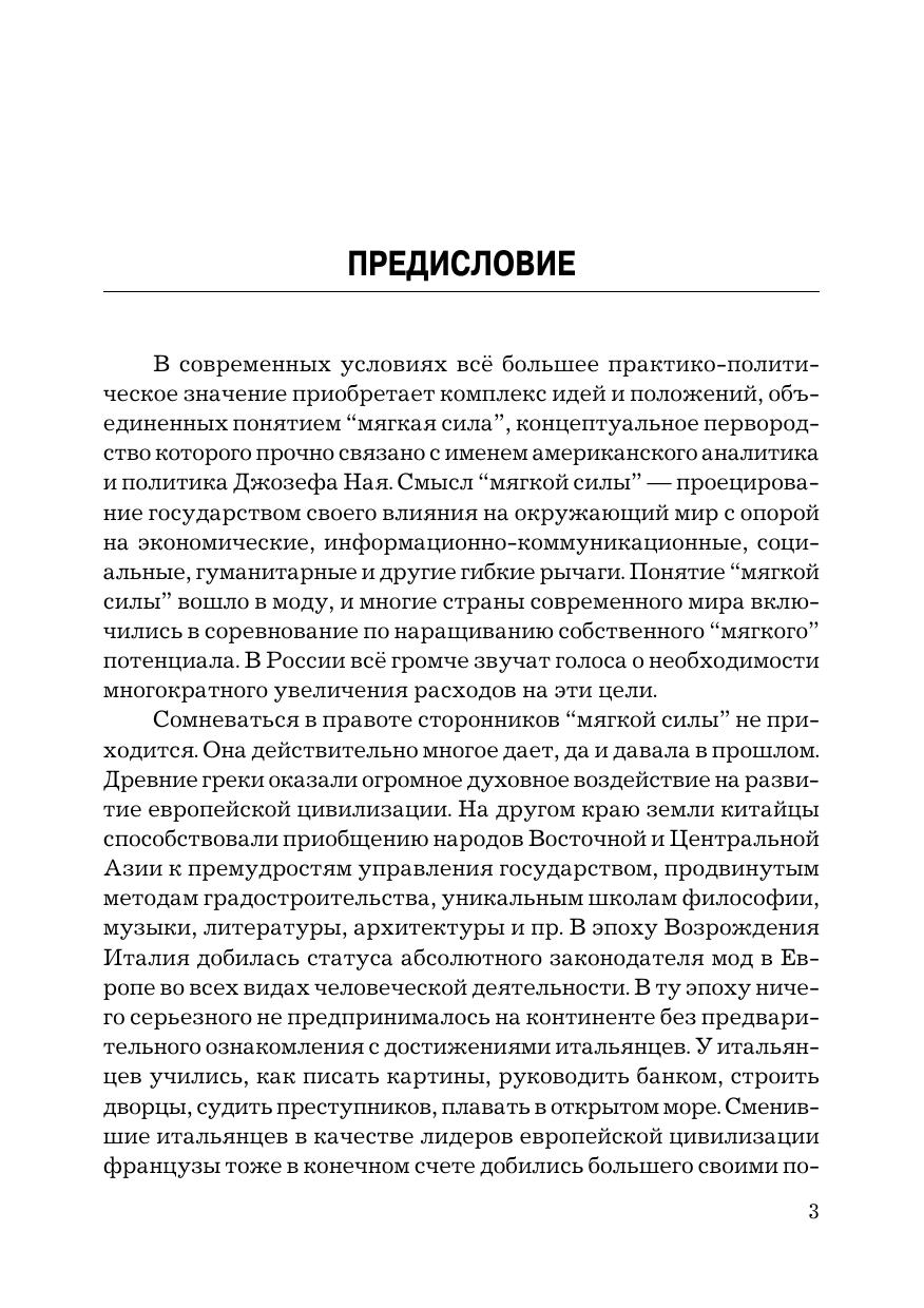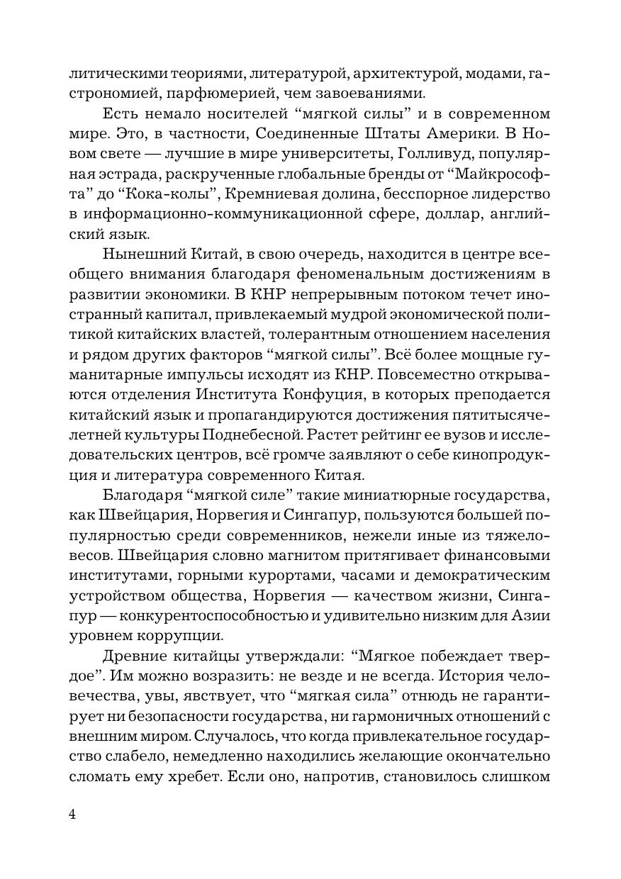 В книге раскрываются особенности проблемного поля «мягкой силы» в кардинально изменившейся геополитической реальности наших дней. В рамках концептуализации «мягкой силы» и анализа баланса между ней и «жесткой силой» исследуется феномен «умной силы» как взаимосвязанная целостность различных компонентов — культурно-гуманитарных, цивилизационных, социально-политических, экономических, военных и т. д. Отражены различные точки зрения на проблематику «мягкой силы», российский опыт ее критического анализа. Издание предназначено для преподавателей, аспирантов и магистрантов профильных вузов и факультетов, а также для широкого круга читателей, интересующихся мировой политикой и международными отношениями.