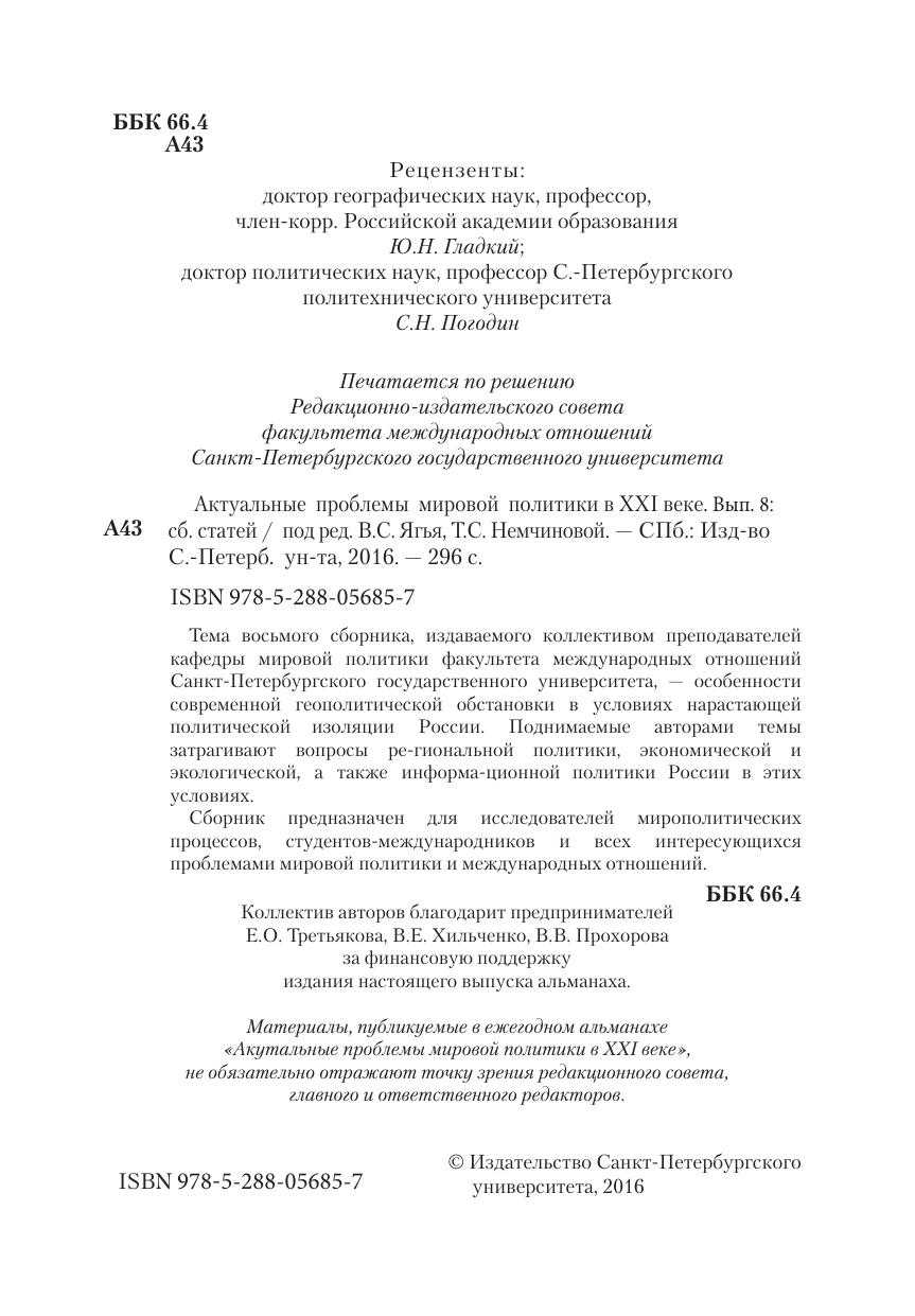 Тема восьмого сборника, издаваемого коллективом преподавателей кафедры мировой политики факультета международных отношений Санкт-Петербургского государственного университета, — особенности современной геополитической обстановки в условиях нарастающей политической изоляции России. Поднимаемые авторами темы затрагивают вопросы ре-гиональной политики, экономической и экологической, а также информа-ционной политики России в этих условиях.