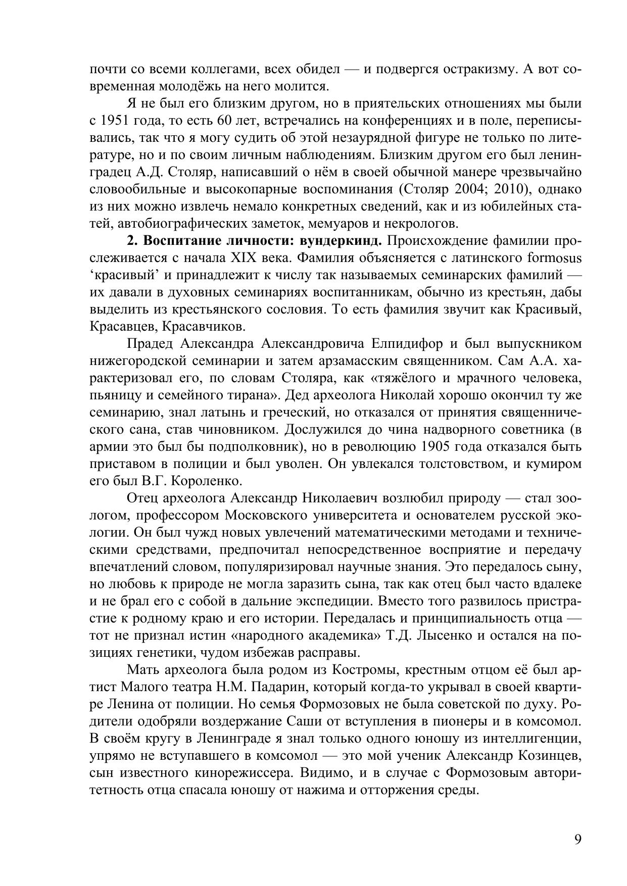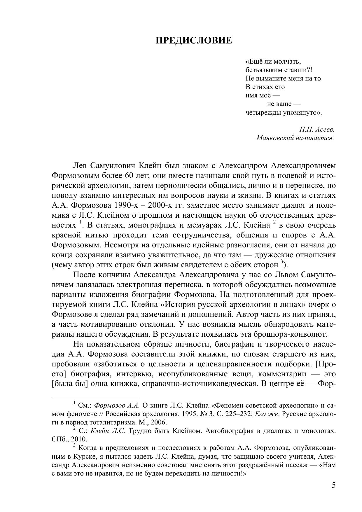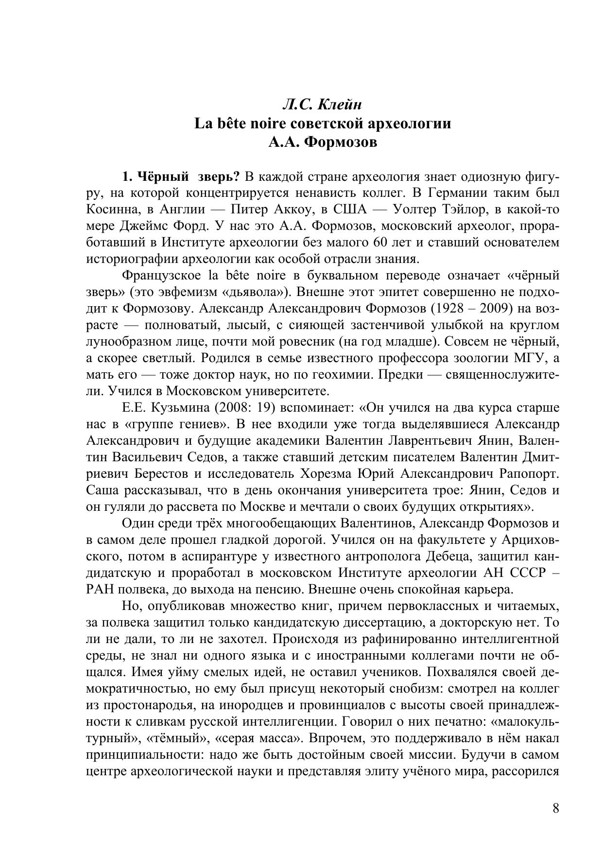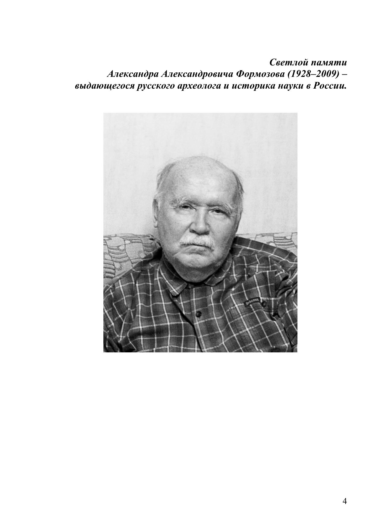 Издание посвящено выдающемуся русскому учёному — археологу, историку, историографу Александру Александровичу Формозову (1928–2009), более полувека служившему научным сотрудником Института археологии Академии наук СССР / РАН, выпустившему ценные труды по эпохам камня и бронзы на территории нашей страны; по первобытному искусству; по истории изучения отечественных древностей; по этике и психологии научного поиска.