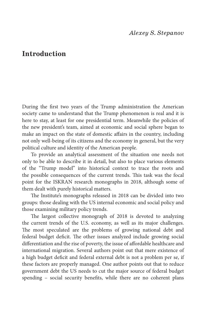 To provide an analytical assessment of the situation one needs not only to be able to describe it in detail, but also to place various elements of the “Trump model” into historical context to trace the roots and the possible consequences of the current trends. This task was the focal point for the ISKRAN research monographs in 2018, although some of them dealt with purely historical matters.