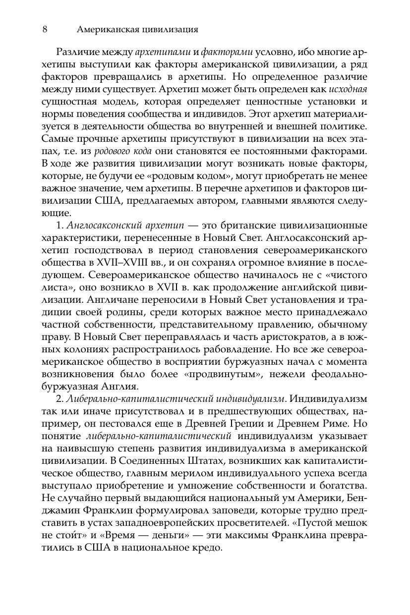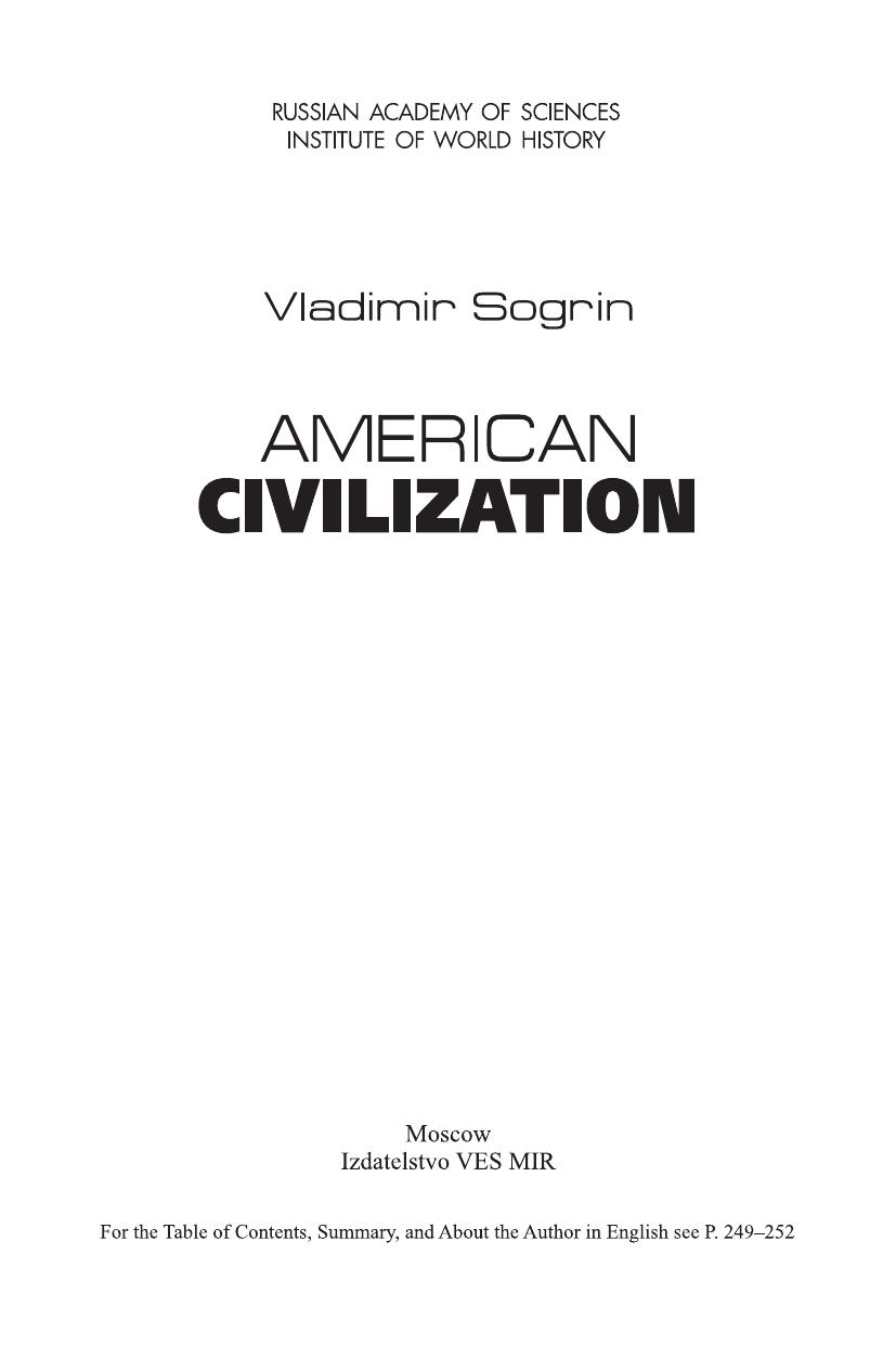 Это первая в отечественной литературе книга о США, основанная на цивилизационном подходе. Английское наследие, демократия и гражданское общество, индивидуализм и равенство возможностей, иммиграция и мультикультурализм, мессианство и экспансия, — эти архетипы и факторы американской цивилизации раскрыты на основе обширного круга источников и литературы. В заключении дано осмысление темы «Американская цивилизация и Россия».