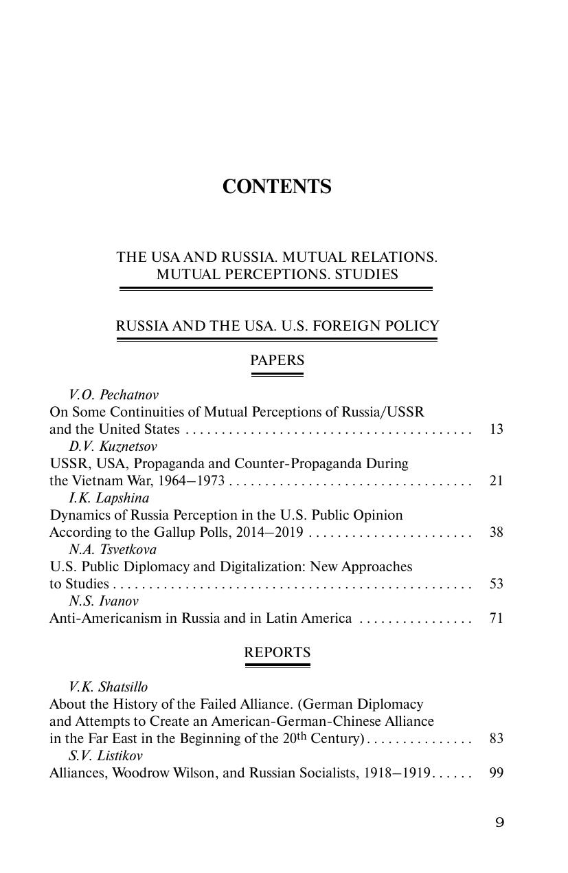 В рубрике «Россия и США. Внешняя политика США» рассмотрены константы взаимного восприятия России/СССР и США, восприятие России американским общественным мнением (2014–2019), особенности антиамериканизма в России и Латинской Америки, роль русской эмиграции в музыкальной жизни США в 1920–1930-х гг., некоторые аспекты православия в Соединенных Штатах, сохранения наследия Русской Америки в исторической памяти современной Аляски и т.д.