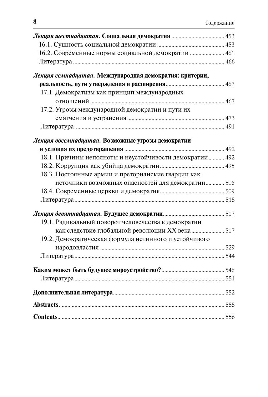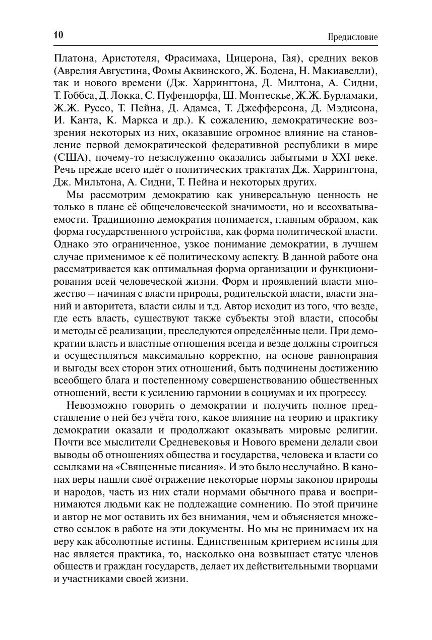 Освещается опыт организации человеческих сообществ, основанный на решении вопросов общественной жизни при равноправном участии всех их членов. В этом контексте демократия трактуется как естественная форма и единственное условие гармоничного функционирования человека, общества и государства. Раскрываются критерии и формы демократии, процессы ее зарождения и развития, особенности ее функционирования в разные эпохи и в различных странах. Обращается внимание на недостатки современной демократии, а также на возможные угрозы демократическому устройству общества. Обосновывается основополагающее значение формирования гражданской ответственности у членов общества за состояние дел в своем обществе и государстве. Для студентов высших учебных заведений, получающих образование по направлениям подготовки (специальностям) «Политология», «Государственное и муниципальное управление», «Социология», «Философия» и другим родственным областям знания. Может использоваться государственными деятелями, лидерами общественных организаций, изучающих и практически решающих проблемы государственно-политического устройства общества. Представляет интерес для интеллектуальных общественных кругов.